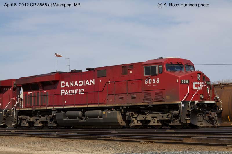 Other Photos (chronological) : 1. CP 8858 at Thunder Bay, ON., painted Candy Apple red without lettering on the hood section. Photo by Bryan Martyniuk, 2007; 2. CP 8858 at Port Coquitlam, B.C., painted Candy Apple red without lettering on the hood section. Photo by Mark Forseille, 2007; 3. CP 8858 at Alyth, Calgary AB., painted in the CPR Vancouver 2010 paint scheme (prior to unveiling). Photo by Adam Meeks, 2007; 4. CP 8858 at Alyth, Calgary AB., painted in the CPR Vancouver 2010 paint scheme (prior to unveiling). Photo by Adam Meeks, 2007; 5. CP 8858 at Port Coquitlam, B.C., painted in the CPR Vancouver 2010 paint scheme. Photo by Mark Forseille, 2007; 6. CP 8858 at Alyth, Calgary AB., painted in the CPR Vancouver 2010 paint scheme. Photo by Cor van Steenis, 2008; 7. CP 8858 at Winnipeg, MB., painted in the Canadian Pacific paint scheme. Photo by A. Ross Harrison, 2010; 8. CP 8858 at Winnipeg, MB., painted in the Canadian Pacific paint scheme. Photo by A. Ross Harrison, 2012.