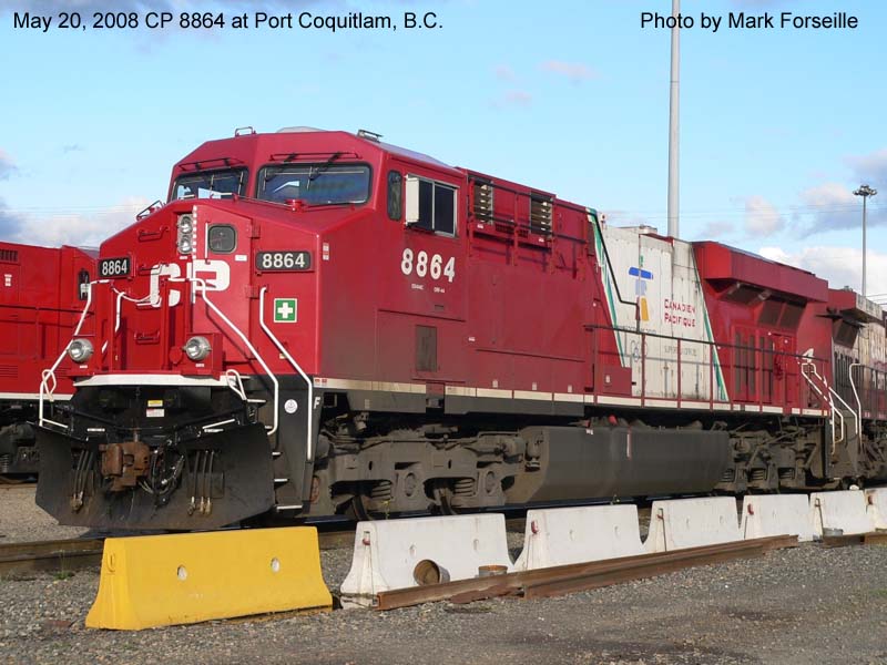 Other Photos (chronological) : 1. CP 8864 at Revelstoke, B.C., painted in the CPR Vancouver 2010 paint scheme. Photo by Greg Sherwood, 2008; 2. CP 8864 at Port Coquitlam, B.C., painted in the CPR Vancouver 2010 paint scheme. Photo by Mark Forseille, 2008; 3. CP 8864 at Winnipeg, MB., painted Candy Apple Red, no lettering. Photo by A. Ross Harrison, 2010; 4. CP 8864 at Winnipeg, MB., painted Candy Apple Red, no lettering. Photo by A. Ross Harrison, 2011.