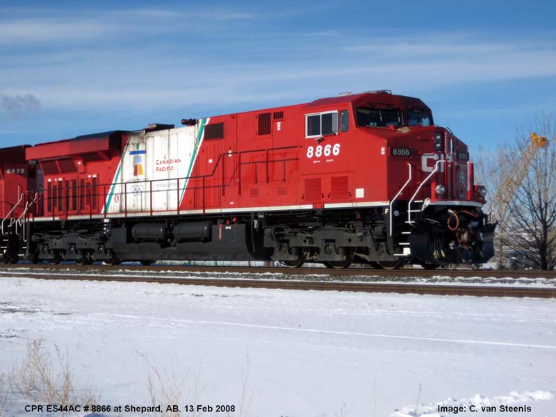 Other Photos (chronological) : 1. CP 8866 at Mactier, ON., painted in the CPR Vancouver 2010 paint scheme. Photo by John Lindsay, 2008; 2. CP 8866 at Shepard, AB., painted in the CPR Vancouver 2010 paint scheme. Photo by Cor van Steenis, 2008; 3. CP 8866 at Shepard, AB., painted in the CPR Vancouver 2010 paint scheme. Photo by Cor van Steenis, 2008.