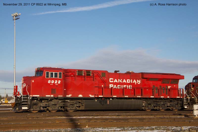 Other Photos (chronological) : 1. CP 8922 at Winnipeg, MB., painted in the Canadian Pacific paint scheme. Photo by A. Ross Harrison, 2011; 2. CP 8922 at Winnipeg, MB., painted in the Canadian Pacific paint scheme. Photo by A. Ross Harrison, 2011.