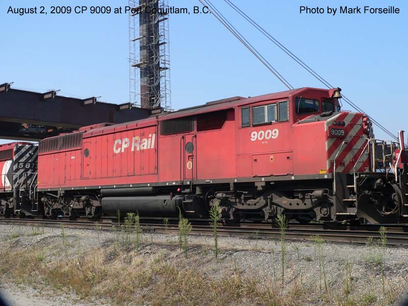 Other Photos (chronological) : 1. CP 9009 at Port Coquitlam, B.C., painted in the CP Rail no-Multimark paint scheme. Photo by Mark Forseille, 2009; 2. CP 9009 at Winnipeg, MB., painted in the CP Rail no-Multimark paint scheme. Photo by A. Ross Harrison, 2009.
