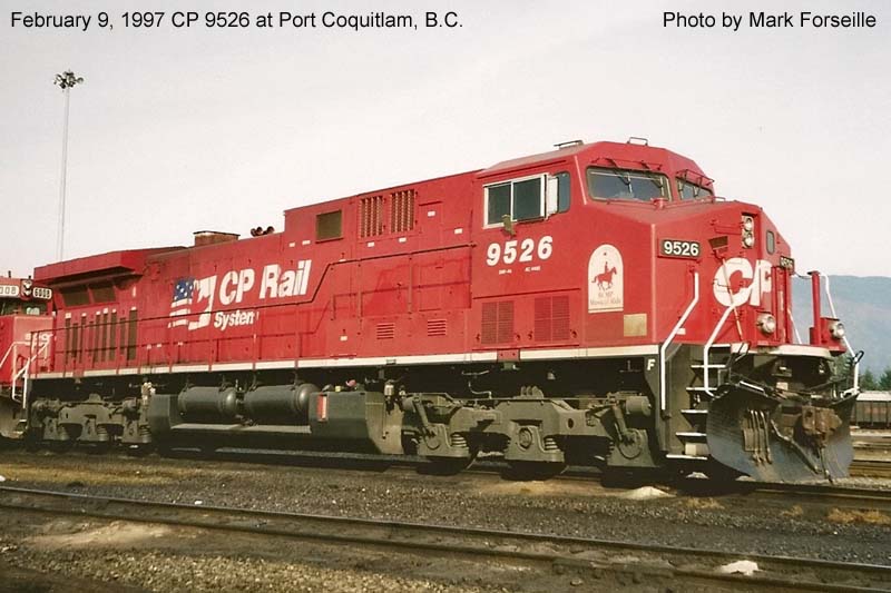 Other Photos (chronological) : 1. CP 9526 at Revelstoke, B.C., painted in the CP Rail Dual Flags paint scheme. Photo by Bill Sanderson, 1996; 2. CP 8006 at Alyth, Calgary AB., painted in the CPR Beaver II paint scheme. Photo by Cor van Steenis, 2018.