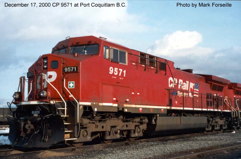 Other Photos (chronological) : 1. CP 9571 at Port Coquitlam, B.C., painted in the CP Rail Dual Flags paint scheme. Photo by Mark Forseille, 1998; 2. CP 9571 at Winnipeg, MB., painted in the CP Rail Dual Flags paint scheme. Photo by A. Ross Harrison, 2011.