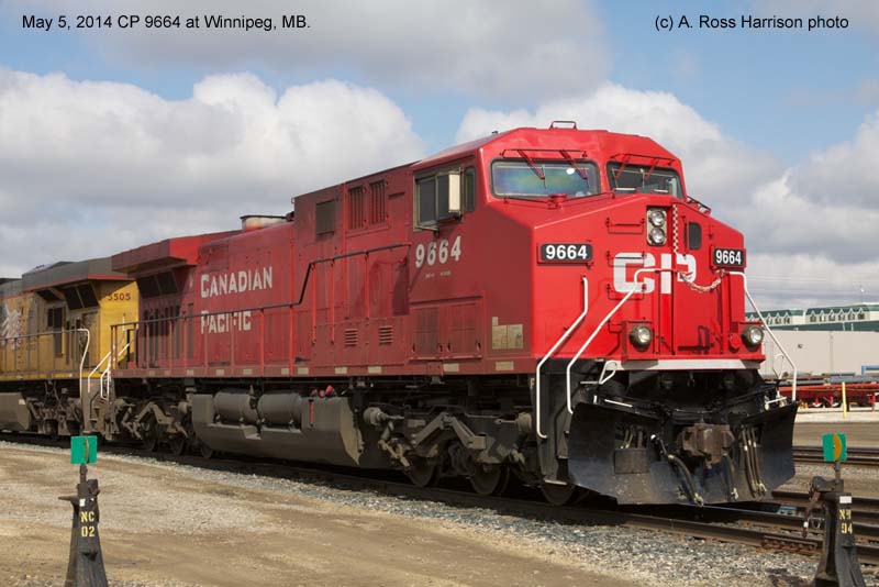 Other Photos (chronological) : 1. CP 9664 at Winnipeg, MB., painted in the Canadian Pacific paint scheme. Photo by A. Ross Harrison, 2014.