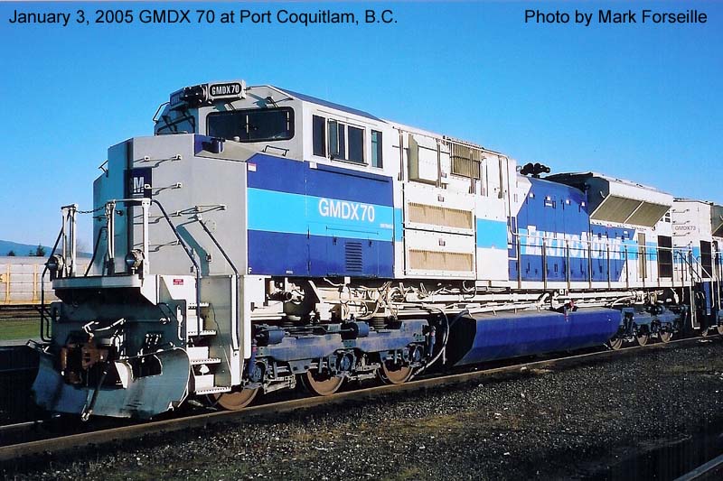 Other Photos (chronological) : 1. GM 70 at Port Coquitlam, B.C., painted in the EMD Demo White/Blue scheme. Photo by Mark Forseille, 2004; 2. GMDX 70 at Field, B.C, rear side, painted in the EMD Demo White/Blue scheme. Photo by Chris Davidson, 2004.