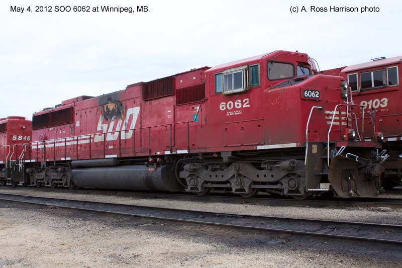 Other Photos (chronological) : 1. SOO 6062 at Winnipeg, MB., painted in the SOO Red paint scheme. Photo by A. Ross Harrison, 2010; 2. SOO 6062 at Winnipeg, MB., painted in the SOO Red paint scheme. Photo by A. Ross Harrison, 2012; 3. CP 6262 at WInnipeg, MB., painted in the Canadian Pacific paint scheme. Photo by A. Ross Harrison, 2018.