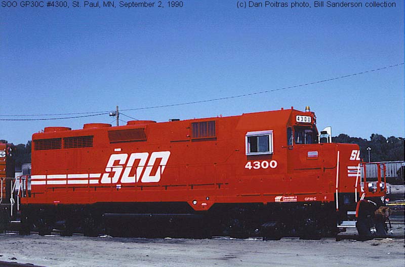 Built by : EMD Built in : 1962 Serial Number : 27541 Paint Scheme : SOO Red This Photo : Dan Poitras, 1990. From the Bill Sanderson collection. Other Photos : none Notes : Built by EMD as UP GP30 #832 (8/1962). Acquired by Generation II Locomotives and rebuilt with a 2,000 Hp. Caterpillar 3516 engine (8/1990). Sold to SOO Line (1991) and renumbered to SOO #4300. Sold to Generation II Locomotives (4/1999). |
