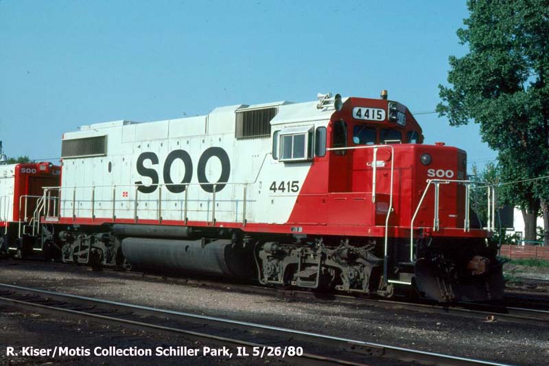 Other Photos : SOO 4415 at Bensenville, IL., painted in the SOO Red/White paint scheme. Photo by George Horna, 1987. From the Bill Sanderson collection.