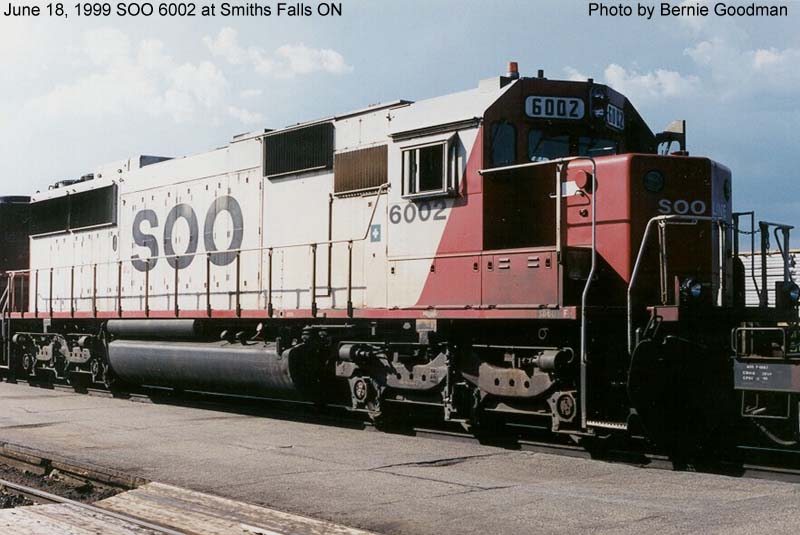 Built by : EMD Built in : 1987 Serial Number : 867164-3 Paint Scheme : SOO Red/White This Photo : J. Eull, 2001. From the E.D. Motis collection Other Photos : SOO 6002 at Smiths Falls, ON., painted in the SOO Red/White paint scheme. Photo by Bernie Goodman, 1999; and SOO 6002 at Smiths Falls, ON., rear side. Photo by Bernie Goodman, 1999. Notes : Declared surplus (10/2006), returned to lessor CIT group (CEFX). Leased out as CEFX #6002 to BNSF Railway. |