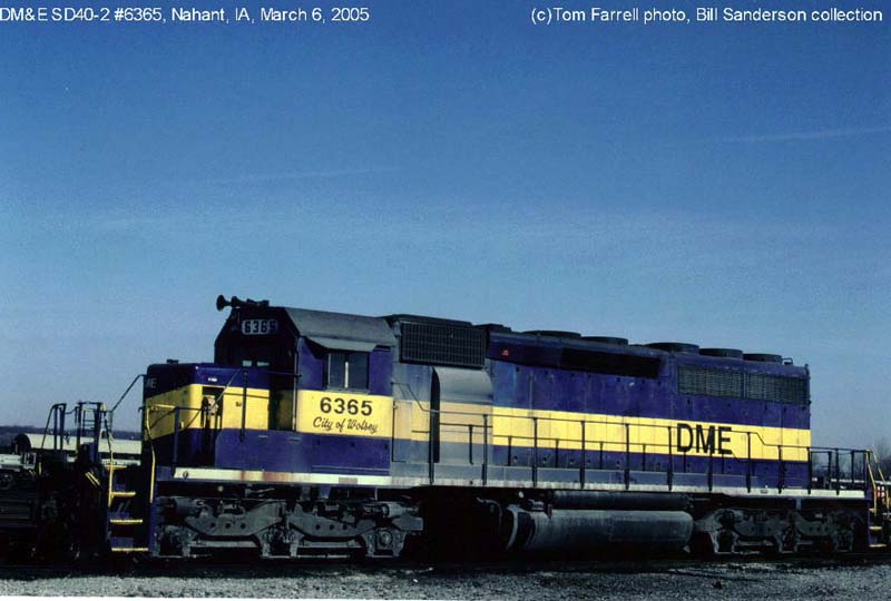 Notes : Built by EMD as Milwaukee Road #204 (7/1974). Acquired by SOO Line (1985) and renumbered to SOO #6365. Retired (7/1989). Sold to HELM Leasing (7/1991), became HLCX #6365. Then sold to DM&E (1/1995), became DME #6365, named "City of Wolsey". |