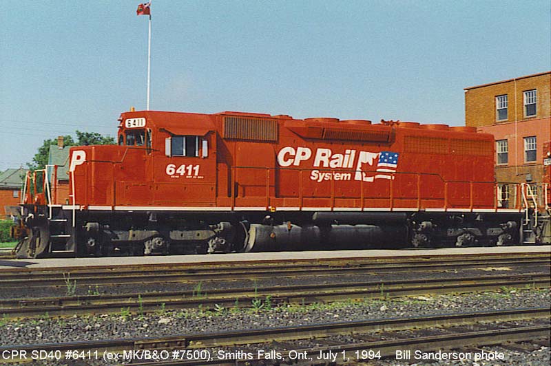 Built by : EMD Built in :1969 Serial Number : 34778 Paint Scheme : SOO Red/White This Photo : Ian Platt, 1991. From the Bill Sanderson collection. Other Photos : CP 6411 at Smiths Falls, ON., painted in the CP Rail Dual Flags paint scheme. Photo by Bill Sanderson, 1994; Notes : Built by EMD as B&O #7500 (6/1969), to MK #7500 (1986), Acquired by SOO and renumbered to SOO #6411 (1988). Acquired by CP (1991), repainted and renumbered to CP #6411 (4/1994). Upgraded to SD40-3 specifications. Sold to Dakota, Minnesota & Eastern (2/2000), became DME #6097. |