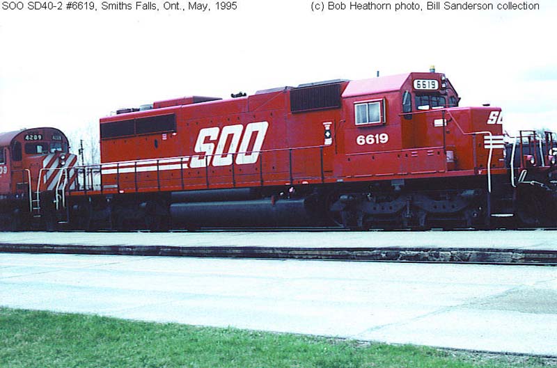 Built by : EMD Built in :1984 Serial Number : 837082-2 Paint Scheme : SOO Red/White This Photo : Ian McCord, 1991. From the Bill Sanderson collection. Other Photos : CP 6619 at Port Coquitlam, B.C., painted in the Canadian Pacific paint scheme. photo by Mark Forseille, 2002; CP 6619 at Smiths Falls, ON, painted in the Ex-SOO Red paint scheme. Photo by Bill Sanderson, 2000; and SOO 6619 at Smiths Falls, ON., painted in the SOO Red paint scheme. Photo by Bob Heathorn, 1995. From the Bill Sanderson collection. Notes : Built by EMD as SOO #6619 (8/1984). Returned to lessor East Coast Motive Power (1999), re-acquired through trade (1999) and renumbered to CP #6619 (1999). Repainted in the Canadian Pacific paint scheme (2002). |
