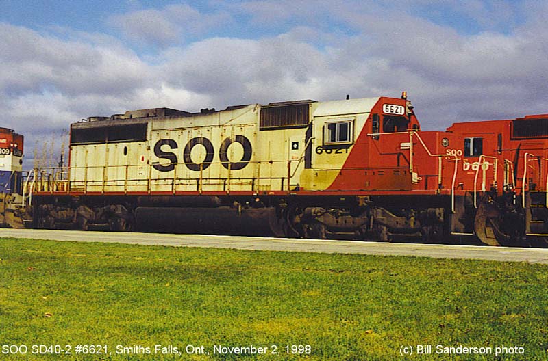 Built by : EMD Built in :1984 Serial Number : 837082-4 Paint Scheme : SOO Red/White This Photo : Bill Sanderson, 1998 Other Photos : SOO 6621 at Smiths Falls, ON., painted in the SOO Red/White paint scheme. Photo by Bill Sanderson, 1998. Notes : Built by EMD as SOO #6621 (8/1984). Returned to lessor East Coast Motive Power (1999), re-acquired through trade (1999), and renumbered to CP #6620 (9/1999). Repainted in the Canadian Pacific paint scheme (8/2002). |
