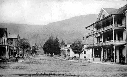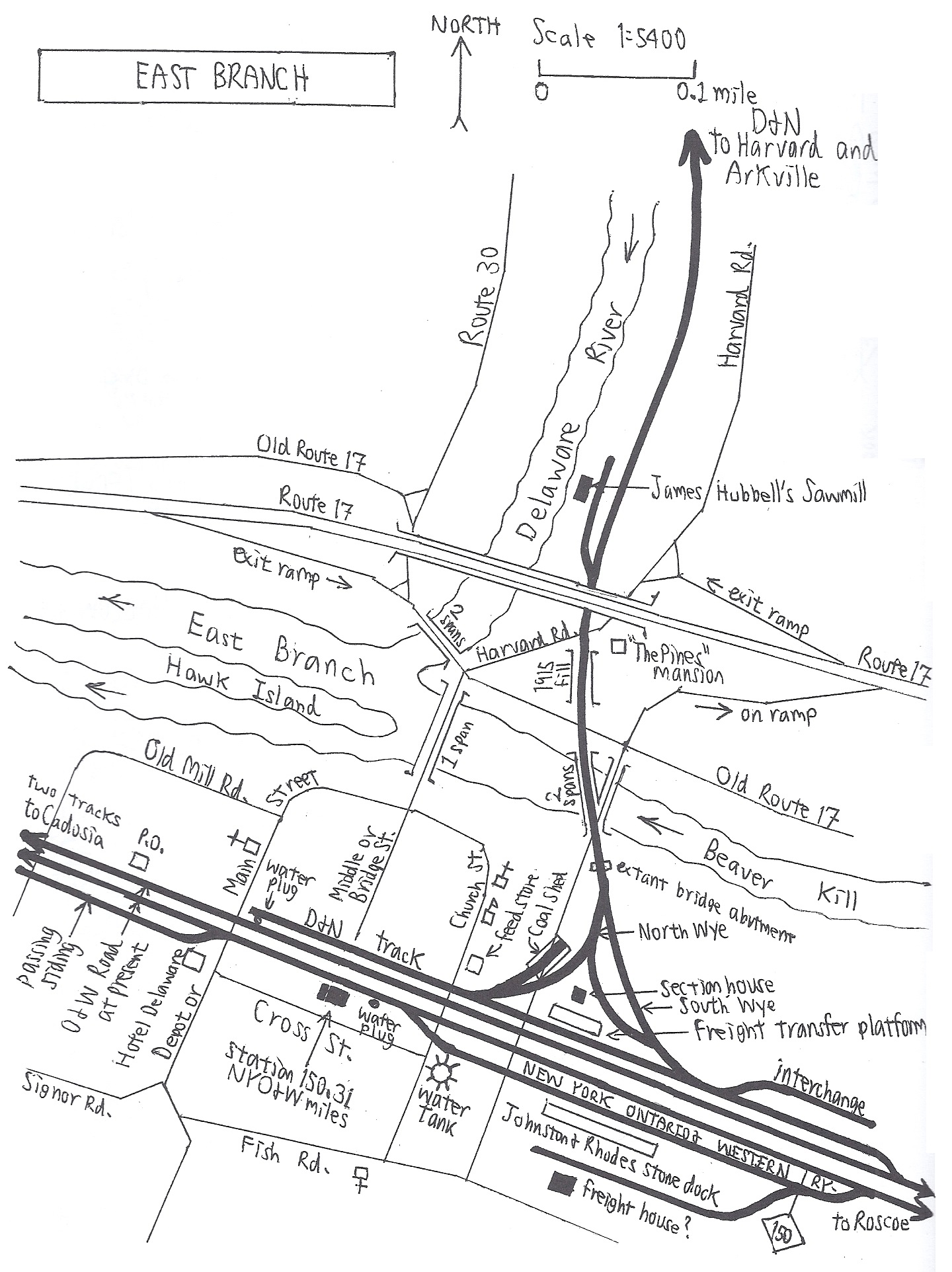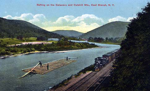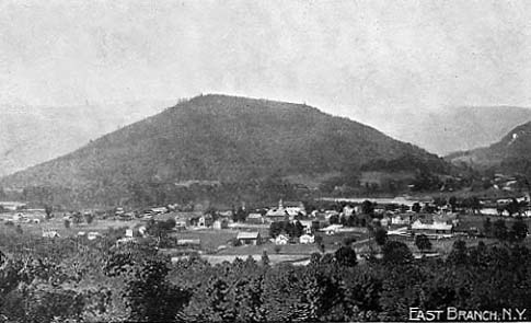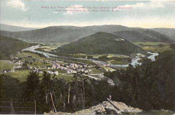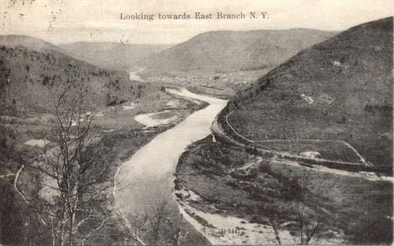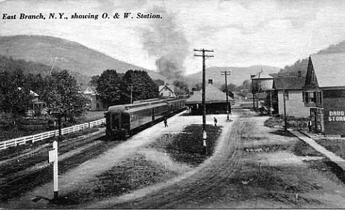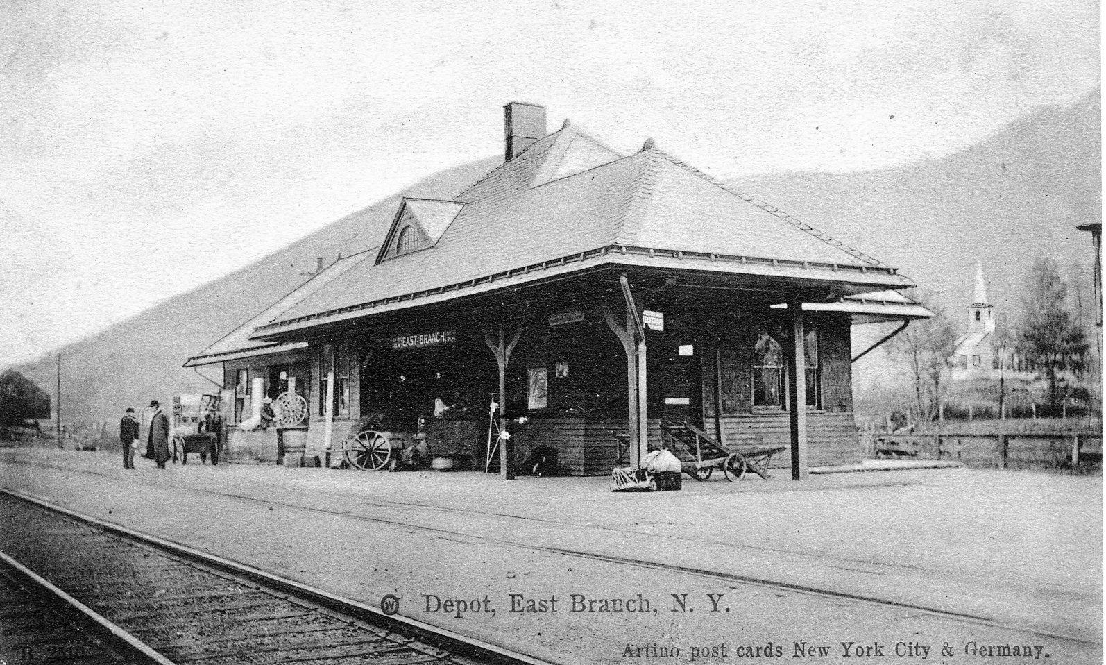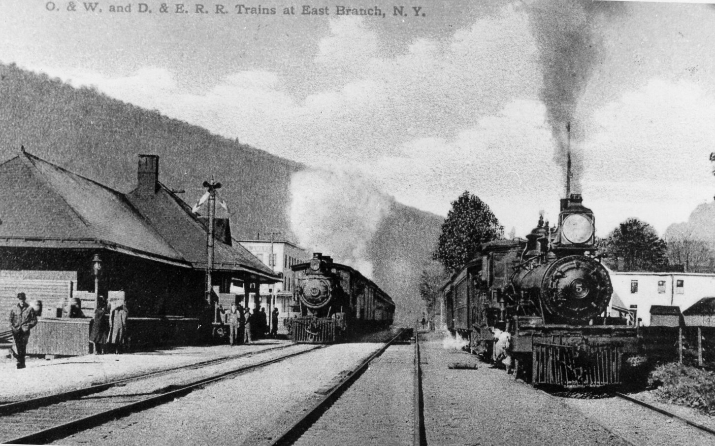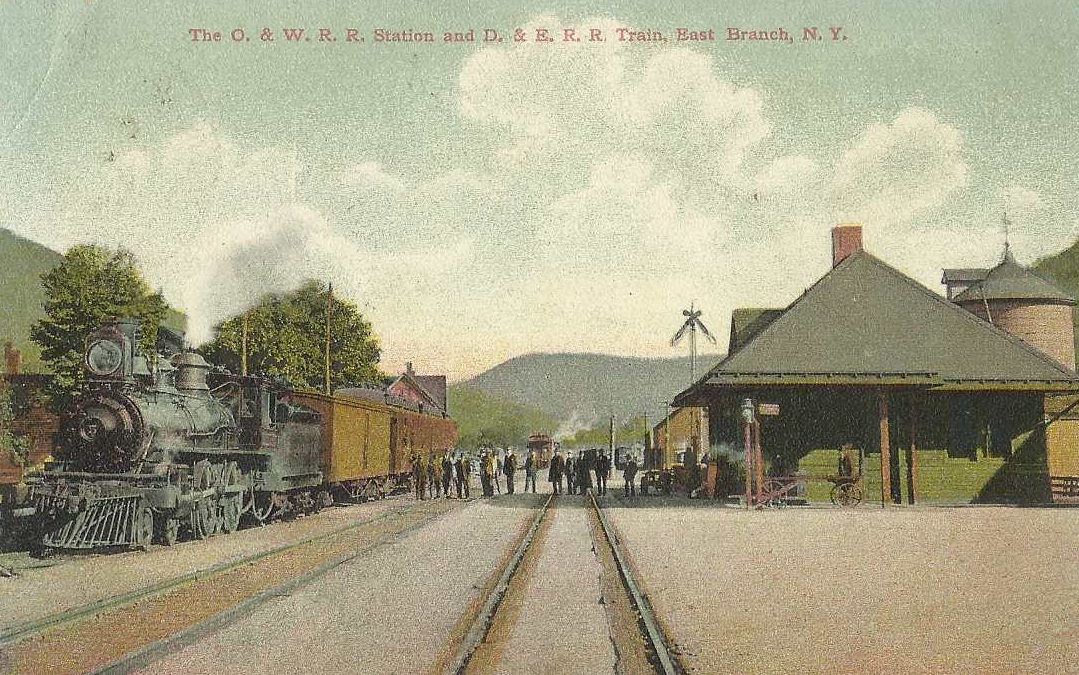 The Hamlet of East Branch is nested at the confluence of the East Branch of the Delaware River and the Beaver Kill. The hamlet was originally called "Beaverkill," after the river. The first settlers here were Samuel Davis and his family who settled here in 1791. East Branch was reached by a forerunner of the New York, Ontario, and Western Railway (the 'O&W') in the early 1870's, which opened up new markets to the hamlet and the southern Catskill Mountains as a whole. Villages and hamlets, like East Branch, became popular with summer vacationists from the big city. Hotels and boarding houses, such as the Hotel Delaware in East Branch, opened up and thrived for a time. Trains of the Delaware & Eastern Railroad (D&E) began operating to East Branch not long after the last spike was driven November 17, 1906. The D&E, and its sucessor the Delaware & Northern Railroad (D&N), interchanged freight here with the O&W and also shared the East Branch Station.