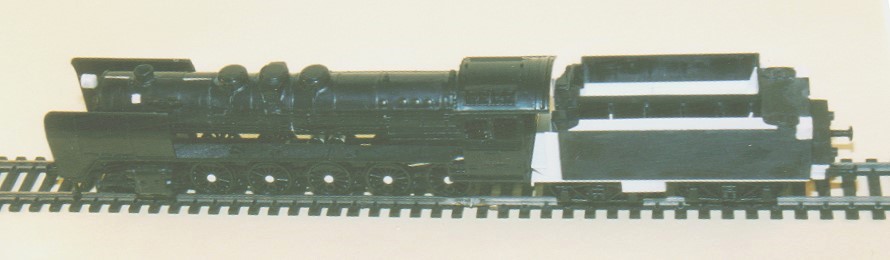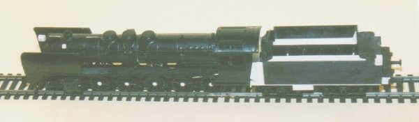 The 56000 tender is derived from the BR44. Basically, German engineers reduced the weight of the tender by cutting down the coal and water capacity. They have also simplified its construction, most noticeably by using diamond bogies. 56086, elevated view of the tender. The body of the Revel BR44 can be used as a starting point. This body has a nearly correct height and is about 5mm longer than required. The toolbox at the back end is also deeper than required. This can be fixed but I choose to keep it as it is, in part to keep the body in proportion with the bogies I had (see later). On the tender body, the main change is to remove the ladders on the back ends. The sides of the body can be easily adapted to match the correct shape. The water tanks opening should be changed but this is tricky to do (I did not do it). I choose to show a nearly empty coal bank. This lead me to built the bank from styrene sheets and place it inside the body. The only tricky part in this task is to fit properly the coal bank with the tender from end. View of a trial assembly loco + tender before painting. The Revel kit provides 3 parts for the frame: