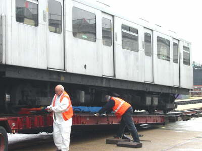 Note the engineer to the left of the picture closely following the wheel of the train with a 'scotch block' which is used to prevent the car rolling off the trailer, should the winch fail