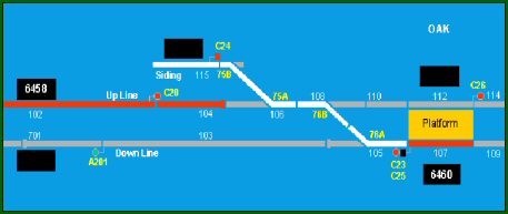 Train 6460 is now signalled to enter the reversing siding. Note all four ends of points reverse and shunt signal C23 clear.
