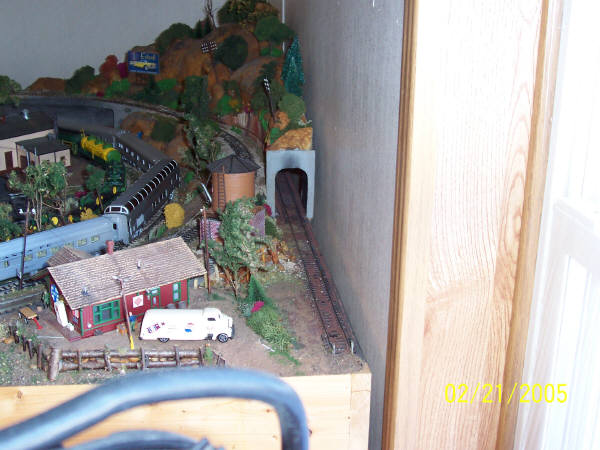 The following photos are various scenes on the layout. Most of the trees are hand made from weeds from my yard and Woodland Scenics ground foam. I made most of the signs myself using an inkjet printer. The posts for the signs are toothpicks, matchsticks or wire.