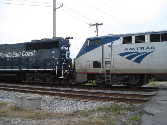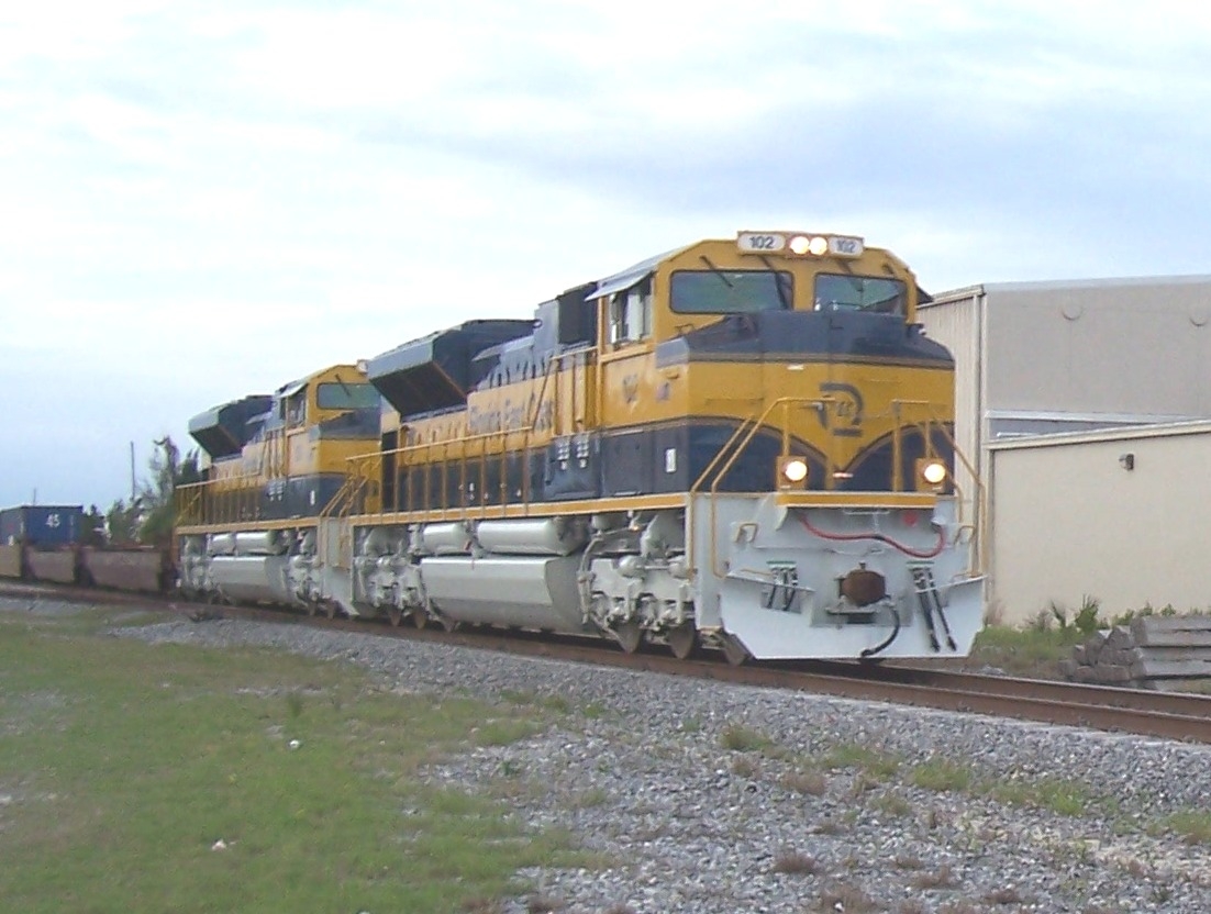 Mr. Alfred Menedez, a first-time visitor to the January 8, 2007 FECNRHS Monthly Chapter Meeting, took this photograph of FEC SD70M-2 #102, followed by sister unit #103 in Melbourne, FL on their maiden run |