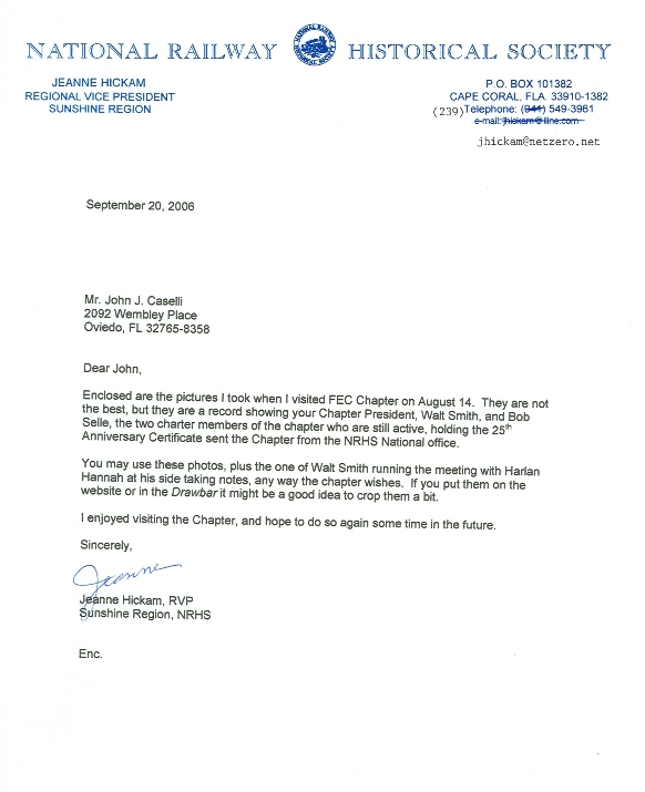 Letter from Ms. Jeanne Hickam, RVP, Sunshine Region, NRHS to the FECNRHS Chapter regarding the photographs in celebration of the chapter's 25th Anniversary |