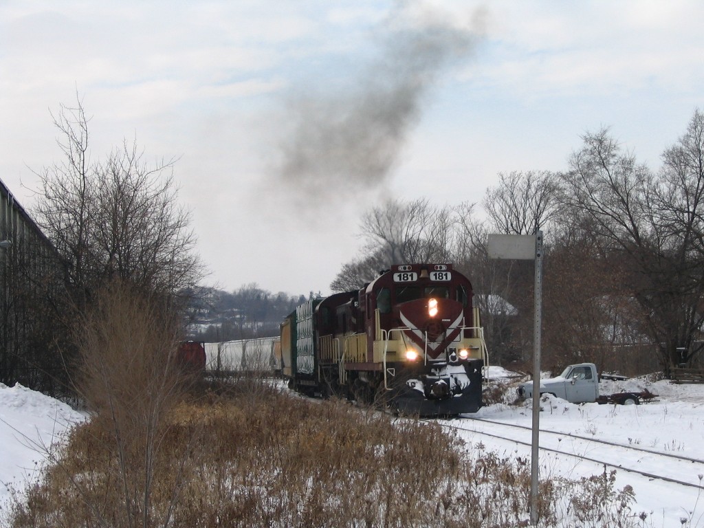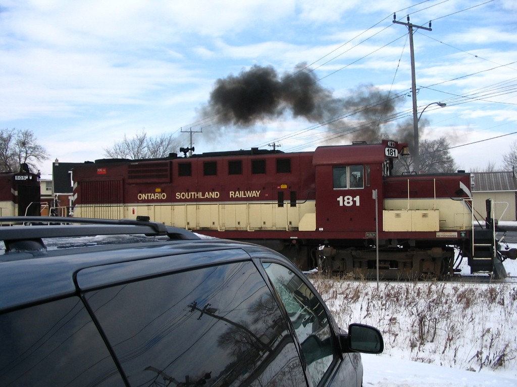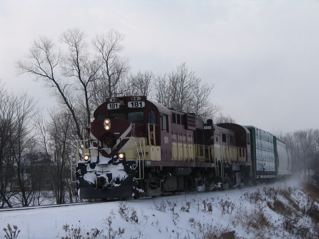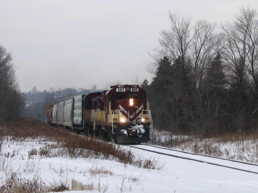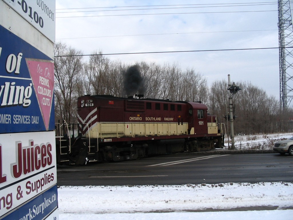 I went into Guelph and caught OSR switching PDI. RS-18u 181 and RS-23 505 switched PDI for over an hour. When it left I finally chased it and caught it at Hume Rd, 1st Line, and 10th SDRD. There were 5 cars, and a caboose following. 1 car was a bulk car of lumber, 3 cars were from PDI and 1 car was of grain, more than likely from bi-pro.