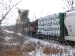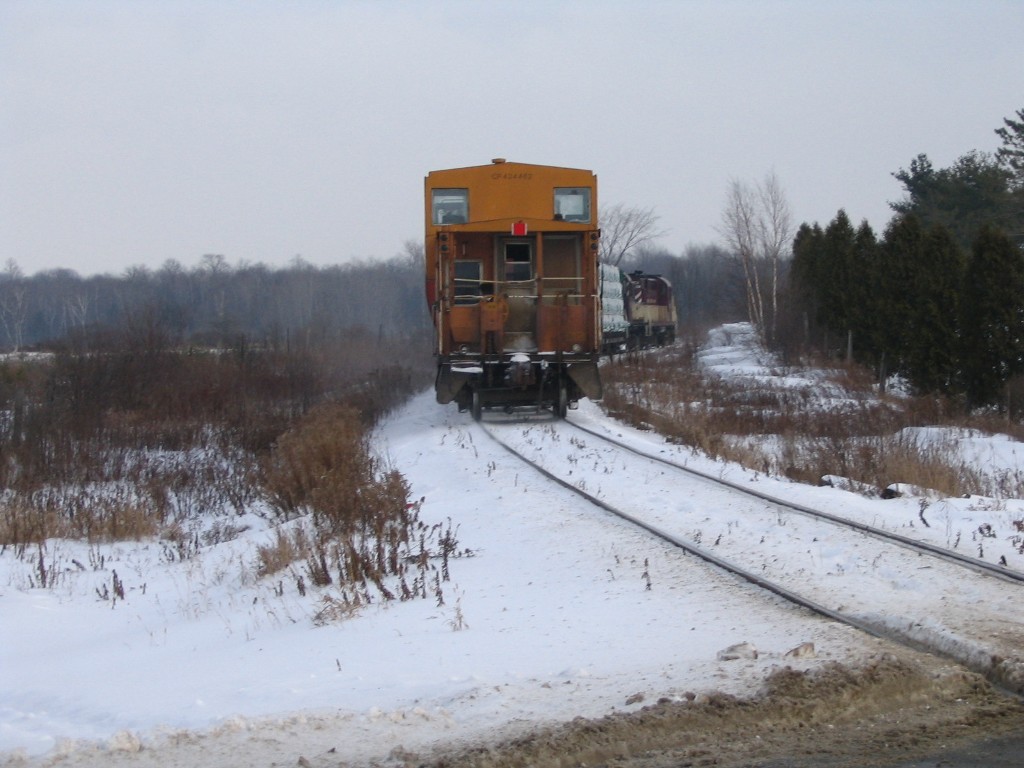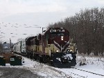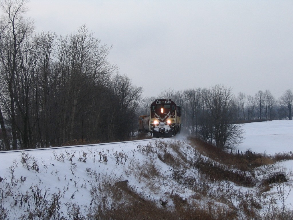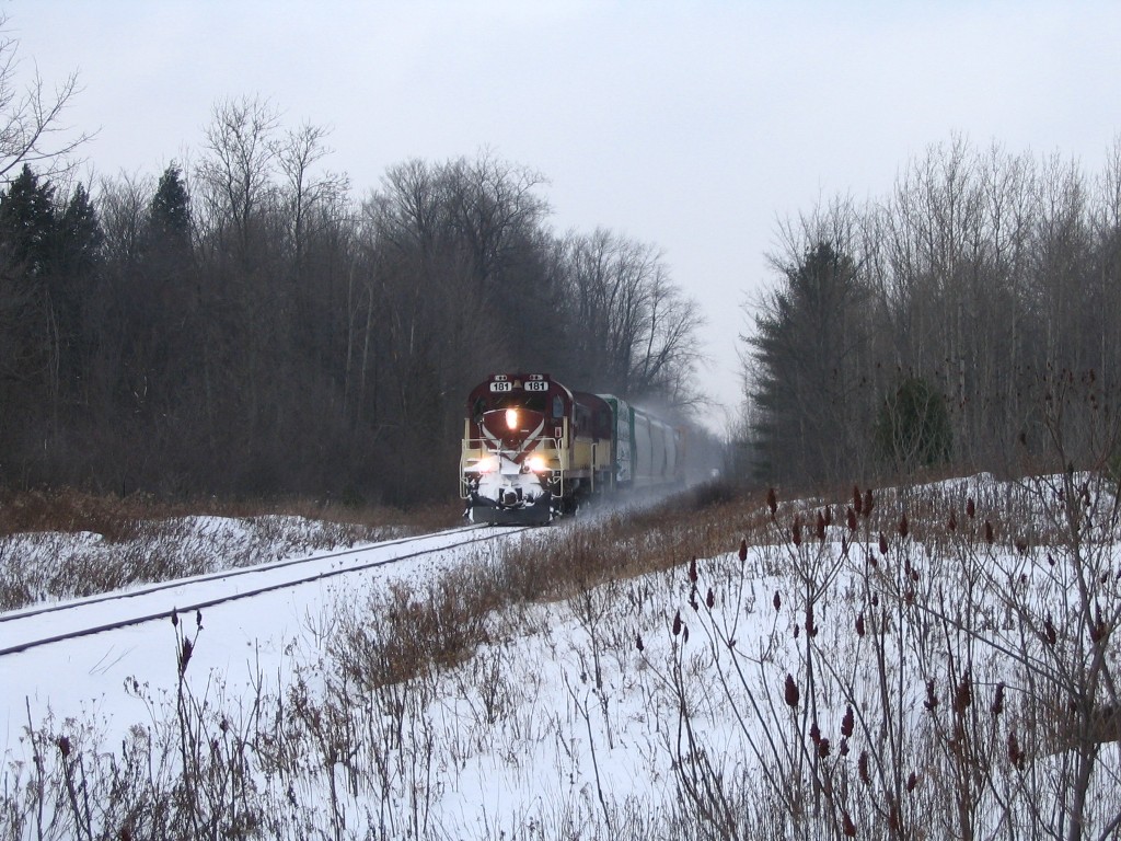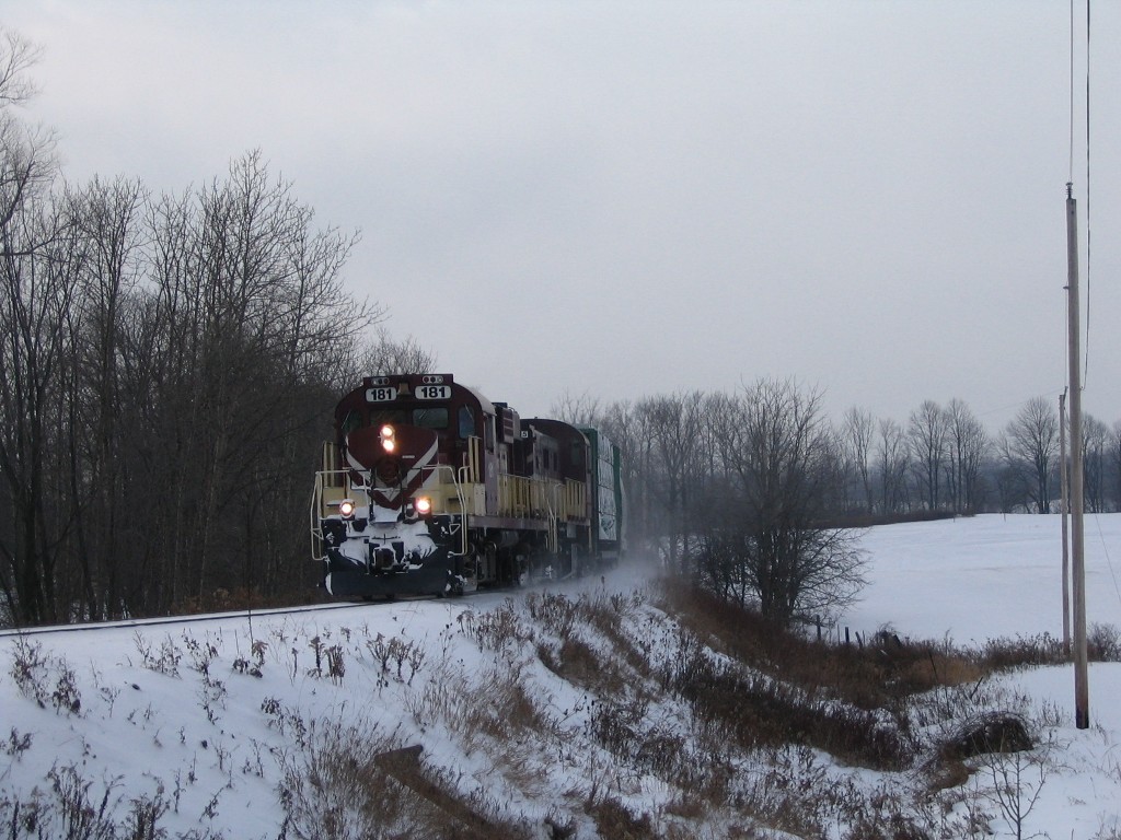 I went into Guelph and caught OSR switching PDI. RS-18u 181 and RS-23 505 switched PDI for over an hour. When it left I finally chased it and caught it at Hume Rd, 1st Line, and 10th SDRD. There were 5 cars, and a caboose following. 1 car was a bulk car of lumber, 3 cars were from PDI and 1 car was of grain, more than likely from bi-pro.