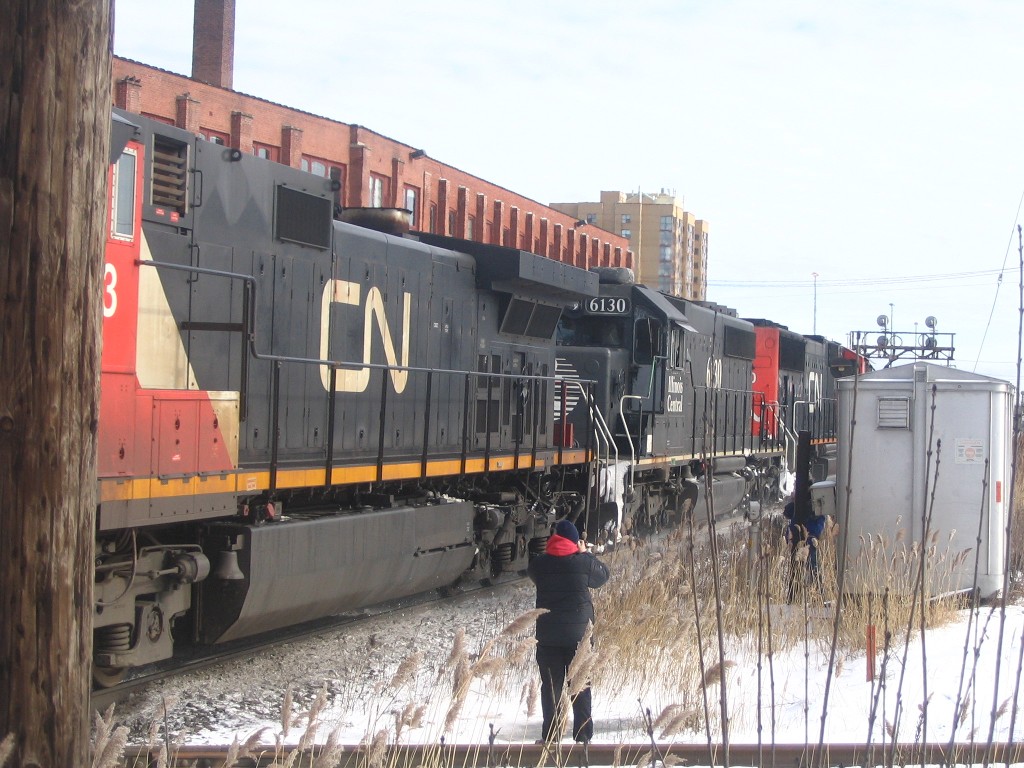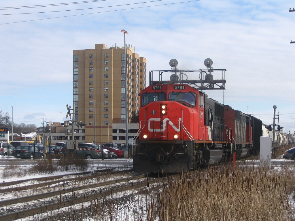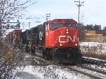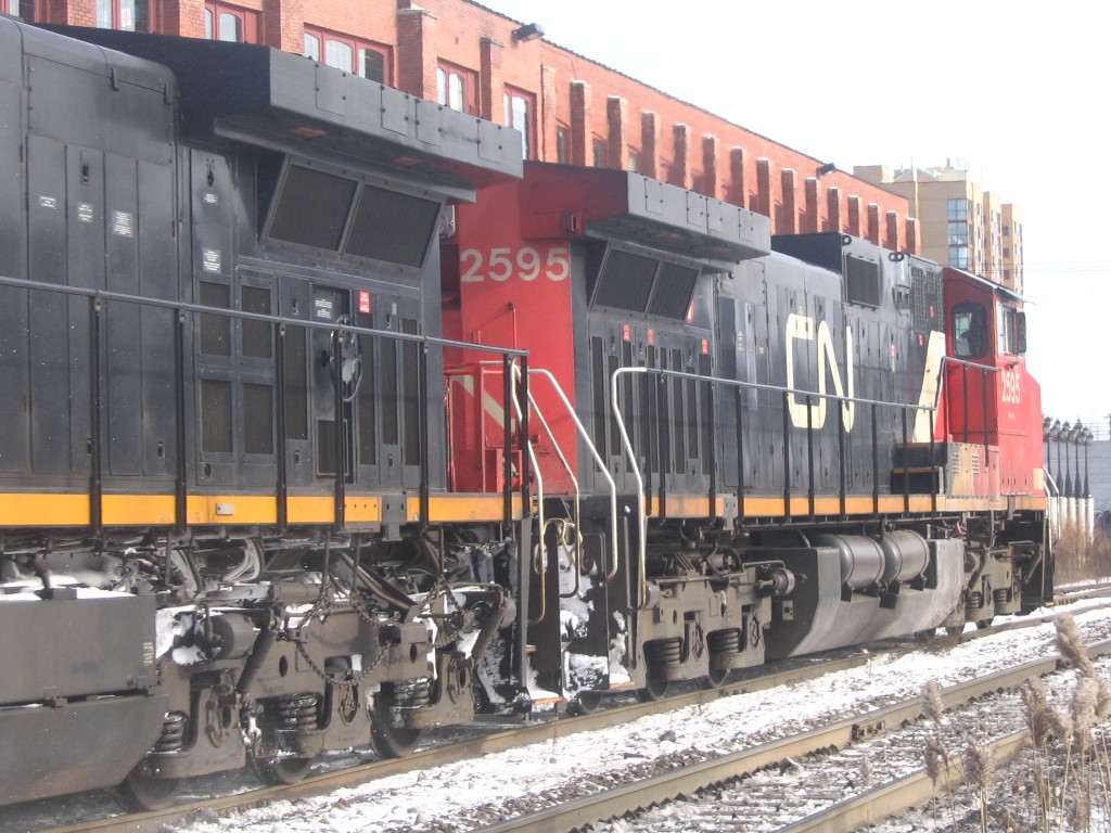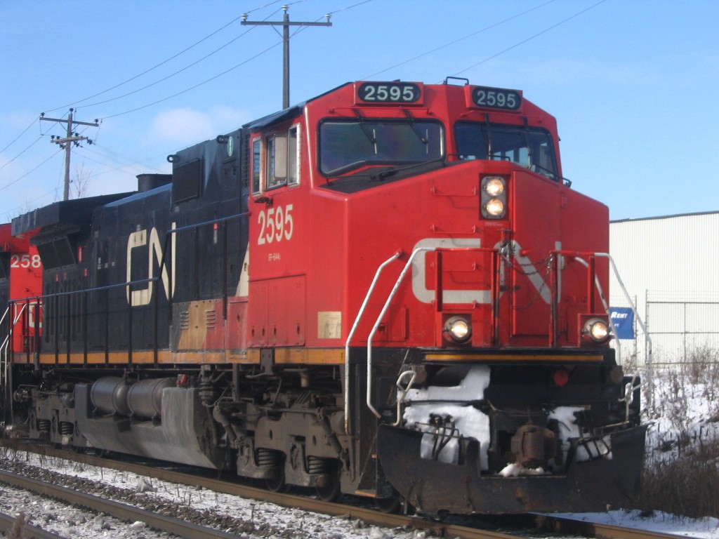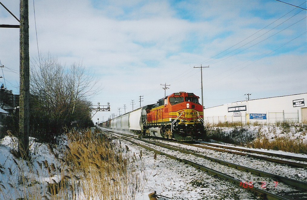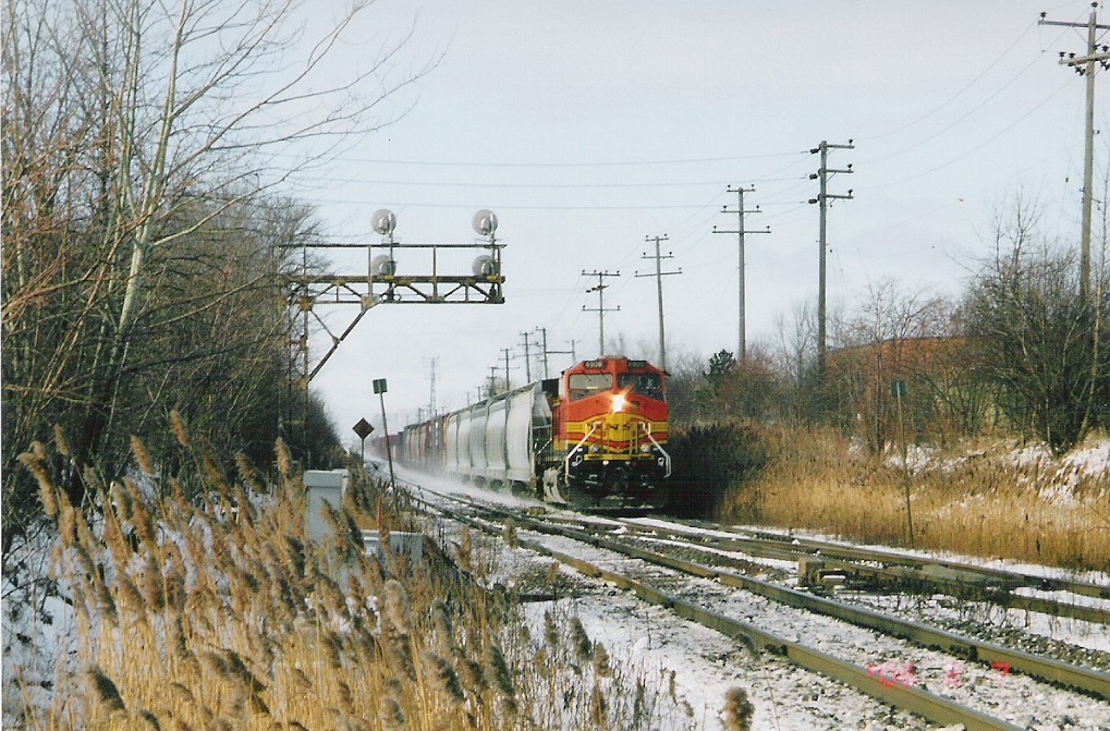 I went to Brampton today and caught up with Mike in hopes of catching OBRY southbound. I got there just after 84 passed then litterally 2 minutes after that an eastbound CN train with BNSF 4908 solo leading a lengthy train (as most tend to be :p). After that about 30 mins later another eastbound once again on the north track with CN Dash 9-44CW's 2595 and 2590 lead another lengthy train. After that VIA 85 came in for a stop at the Brampton station, at the same time 393 came rushing eastbound with SD75I 5800 with IC 6130 and CN 2633. I then caught one last westbound freight with 5791 and 5559 leading. We went into the train shop where we could see OBRY and CN from. We ended up just catching OBRY crossing the diamond at around 1230. We chased her south catching up with it as it passed under the 401 then once more at Alpha Mills Rd. We then headed home.