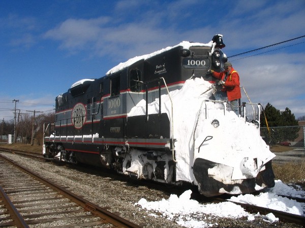 Caught OBRY 1000 in Streetsville showing evidence of its battles with drifts between Orangeville and Brampton as the Engineer Steve clears snow from the front of her.