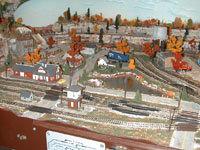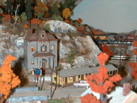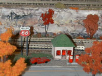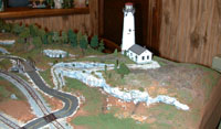 I have been model railroading for just a little over 3 years and Missouri Pacific is my favorite road name followed by Santa Fe. When I was little we lived in Veterans housing, about 30 yards from the Mo. Pacific tracks. Those steam locomotives and newer diesels, were a part of everyday life. I saw them everyday and heard them every night. When I would visit my grandpa, he would take me to a local shopping area, and we would have to cross a railroad track. The crossing gates were operated manually by the man in the signal shack. At the time, I thought that he had the best job in the world. I also had a uncle that had a terrific H.O. layout and I promised myself that someday I would build one too. Half a century later, after taking my eldest grandson to a GATS show, he held me to my promise. N scale was my choice because of the economy of space it allows. Change-over era, steam to diesel, would be my choice. My favorite part of the hobby is landscaping. My home layout is a fictional Missouri town I call Silver Falls, along route 66. Local industries include coal mining, a quarry and a small chemical plant. My track configuration is not representational of the actual MO-PAC lines that ran through my neighborhood. Three of the business structures are however, as close to the original buildings as I could remember them. These buildings were located at the Bates St. crossing and so I decided to add the "Bates Motel and mansion" just for laughs. My first module was inspired by a trip to Wisconsin. The lighthouses and Kettle Moraine glacial deposits were the bass for this module. March 7, 2001 |