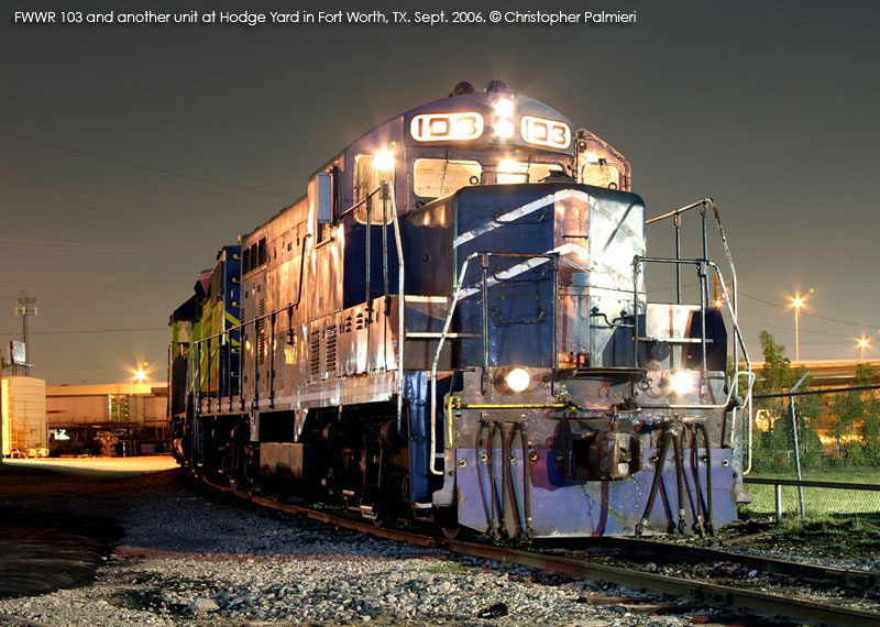 Shortly before it was sent to NRE for conversion to 2GS14B genset switcher 2013, Christopher Palmieri photographed Fort Worth and Western 103 at FWWR's Hodge Yard. Sept. 13, 2006. Click to enlarge. |
