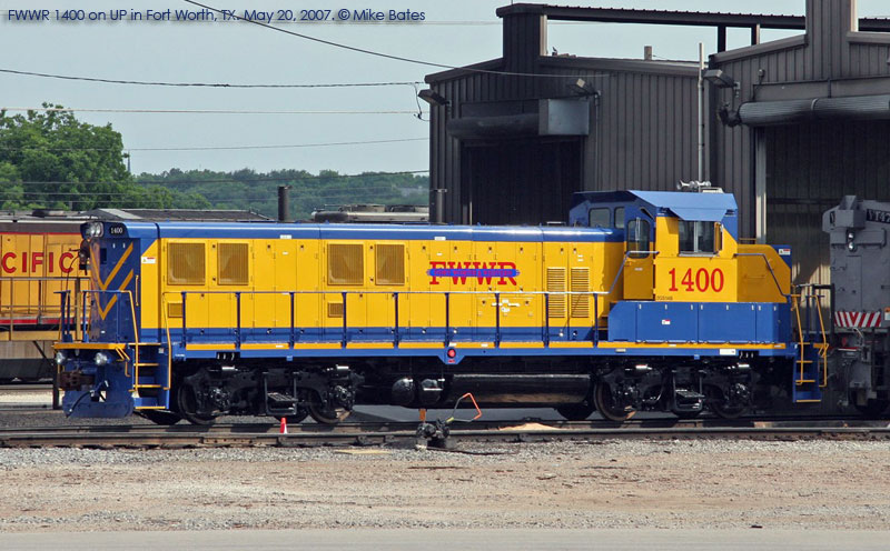 Mike Bates caught the FWWR 1400 at UP's engine house in Fort Worth on the last leg of its trip to the Fort Worth and Western. May 20, 2007. Click to enlarge. |