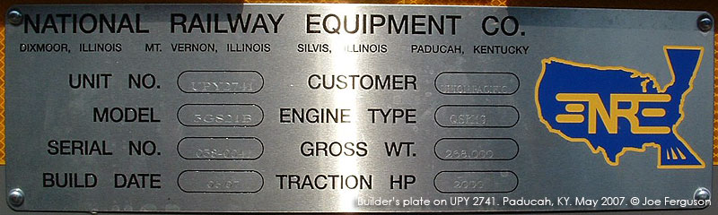 UPY 2741's builder's plate while the locomotive is at NRE's facility in Paducah, KY. Photo by Joe Ferguson. May 2007. Click to enlarge. |