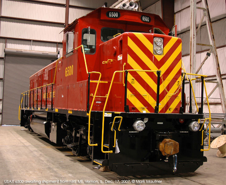 Mark Mautner caught USAX 6500 at NRE Mt. Vernon in mid-November. The unit should ship to Texas some time in late Jan. 2008, along with USAX 6501. Update: 6500 and 6501 were expected to be picked up by UP around Jan. 14, 2008 for movement to Texas. |