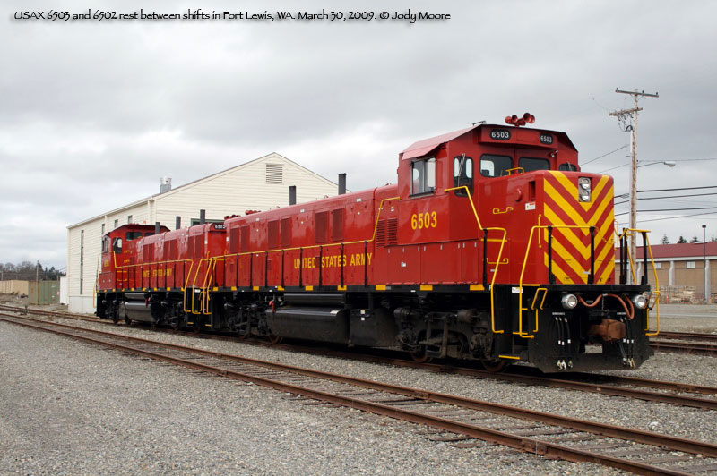 USAX 6503 and 6502 idle between duty calls at Fort Lewis, WA. Photo by Jody Moore. March 30, 2009. Click to enlarge.