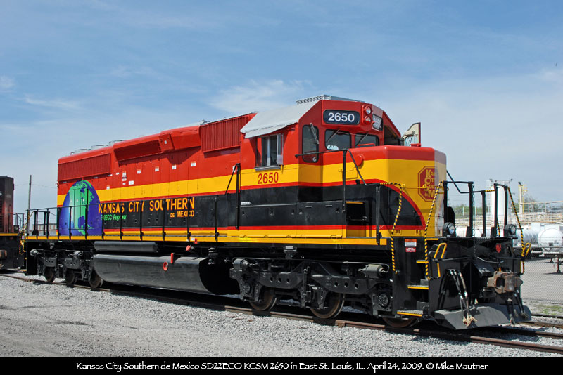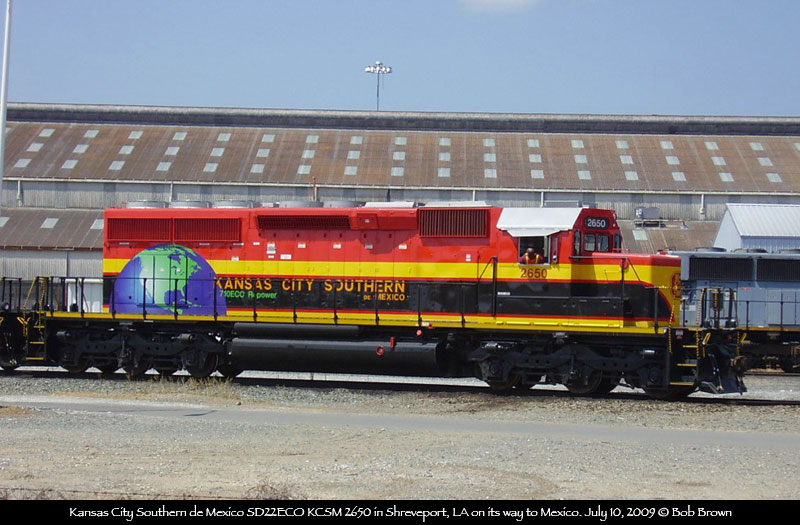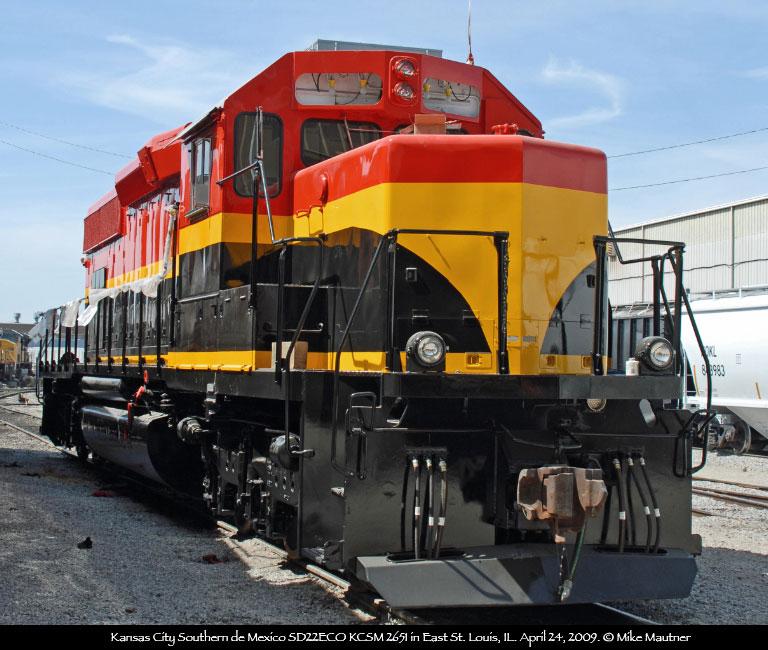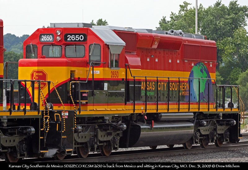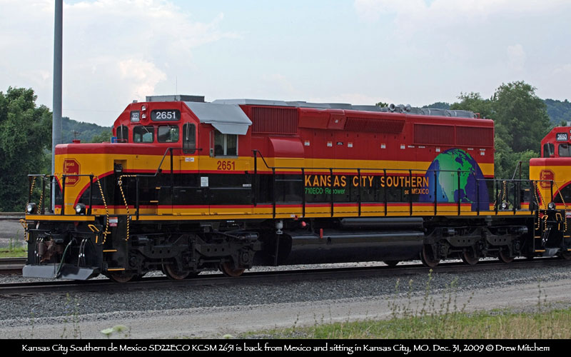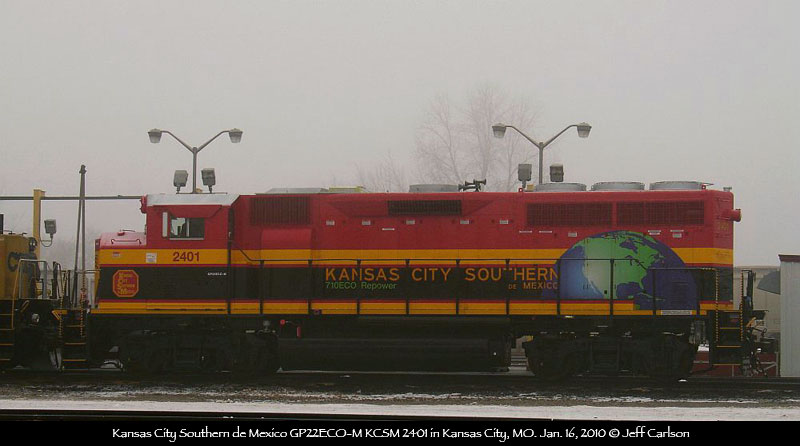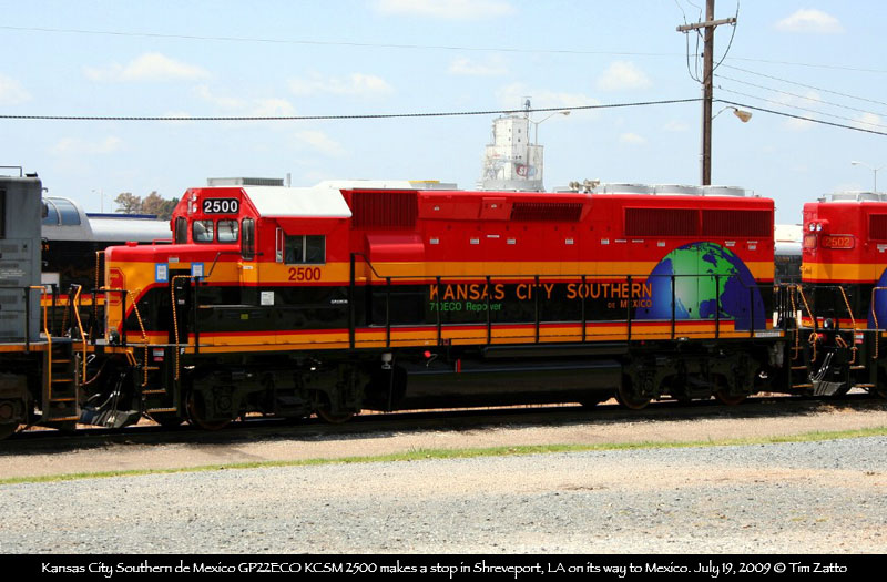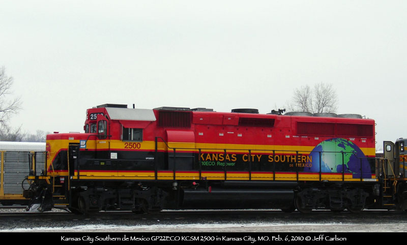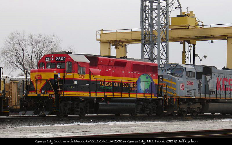 D. After being sent to Mexico, KCSM 2500 returned to the US to turn some demonstration miles for EMD. Noted demos during 2009-2010 include CSX, System-wide (Nov. 2009); Alabama Southern RR, Tuscaloosa, AL (Dec. 2009); Iowa, Chicago & Eastern, Marquette Sub (Feb. 2010). Moving on TP&W/CP train in MN in late Feb. 2010.