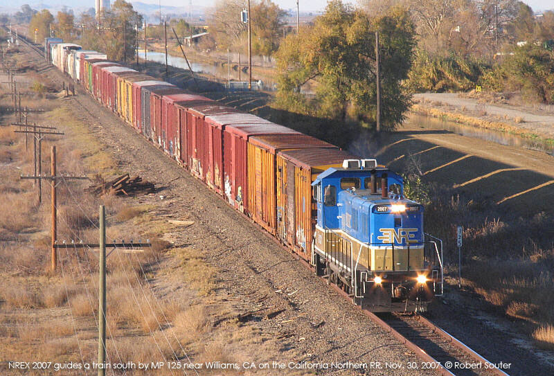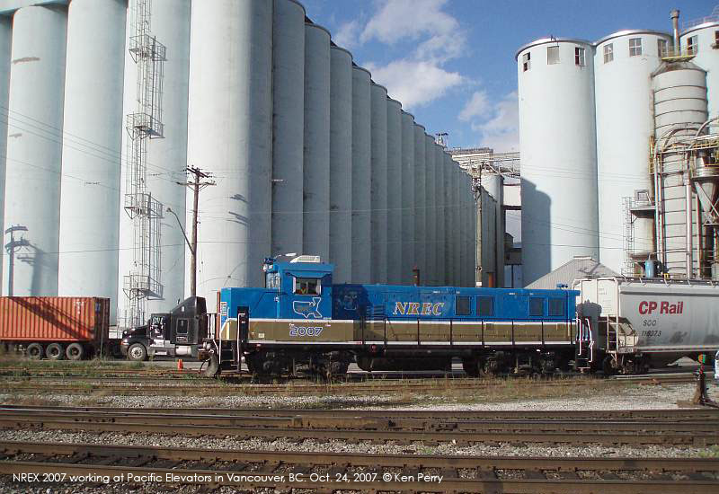 B. NREX 2007's demonstration tour has included stops at CSX, Jacksonville, FL (March 2007); CP, Calgary, AB (May-June 2007); Tacoma Rail, Tacoma, WA (Aug. 2007); Alaska Railroad, Anchorage, AK (Sept. 2007); Pacific Grain Elevators, Vancouver, BC (Oct., 2007); California Northern (Dec. 2007); Modesto & Empire Traction, Modesto, CA (Feb. 2008); Central California Traction, Stockton, CA (March 2008); Stockton Terminal & Eastern, Stockton, CA (March 2008); Richmond Pacific, Richmond, CA (April 2008); San Joaquin Valley Railroad, Fresno, CA (May, 2008); Southern Railway of BC, New Westminster, BC (August-Sept. 2008); Trans-Canada Switching, Roberts Bank, BC (Sept. 2008); ADM, Decatur, IL (Jan. 2009). From various NRE press releases and other sources.