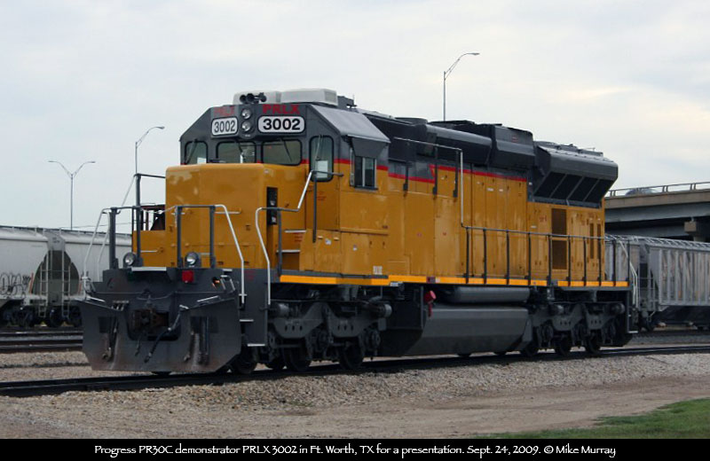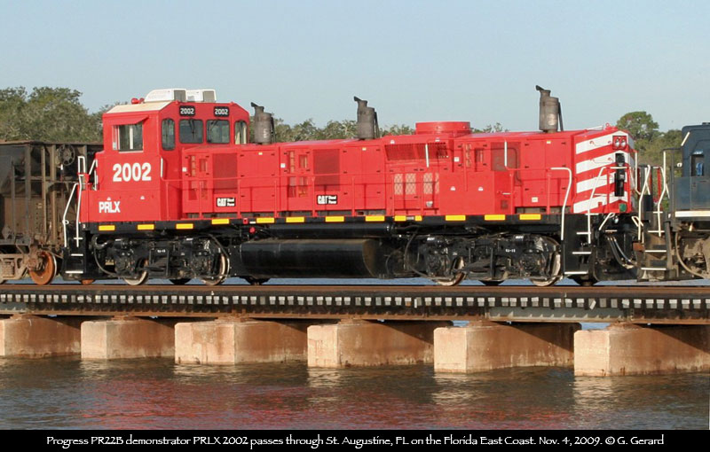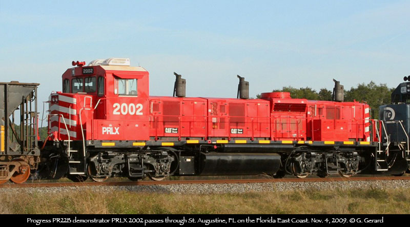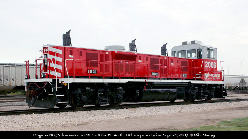 J. PRLX 2008 first spotted in transit from Progress' Mayfield, KY facility in early Sept. 2008. Unit was shrink wrapped from the frame line up during initial transit to Chicago. From Joe Ferguson. At the Railway Supply Institute's Railway Technology Exhibition in Sept. 2008, Progress finally unveiled this unit as its 3-engine genset, model PR22B. The model features three CAT C18 engines generating 745 hp each. The locomotive touts a modular design, with easy removal of each of the gensets, and a dynamic brake option, which this locomotive is built with. Build data was not available for this unit at the convention.