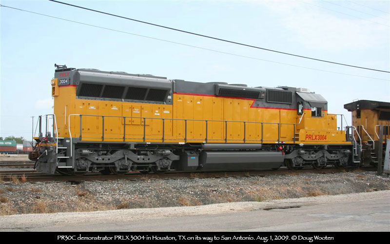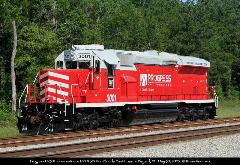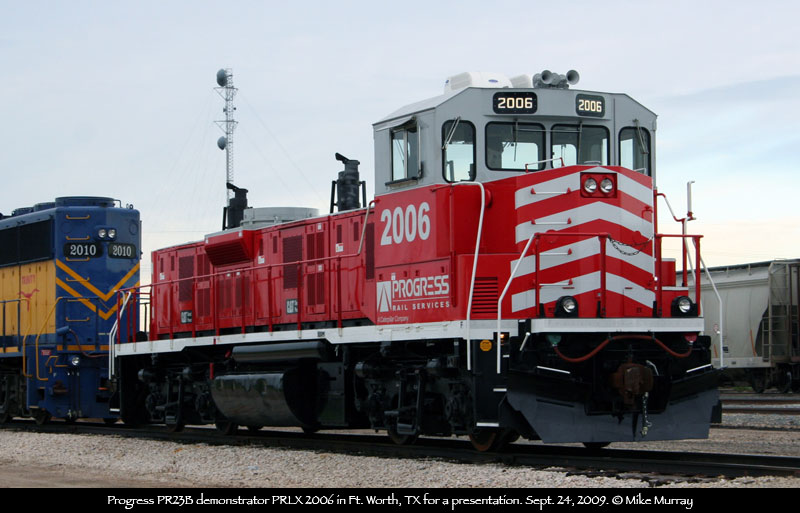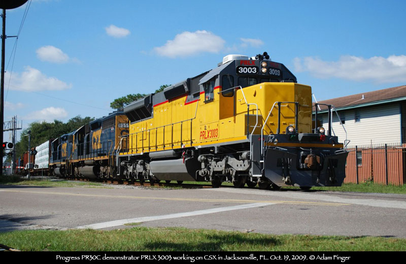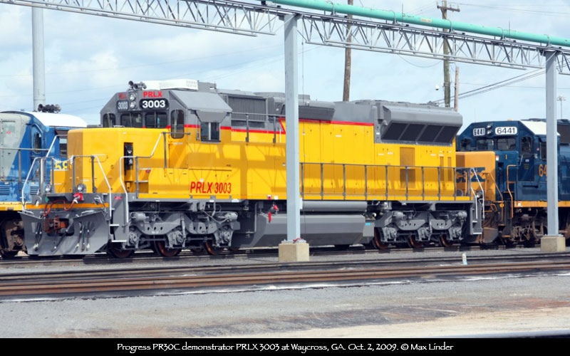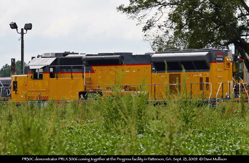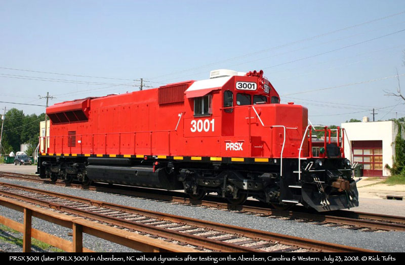 A. First demonstrated on Aberdeen, Carolina & Westerns in solid red paint and numbered PRSX 3001. Returned to Progress in Patterson, GA in July 2008. When it emerged for further demonstration, the unit had been repainted in Progress red, gray and white, been modified with dynamic brakes, and renumbered PRLX 3001. From various reports and sightings.