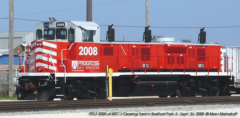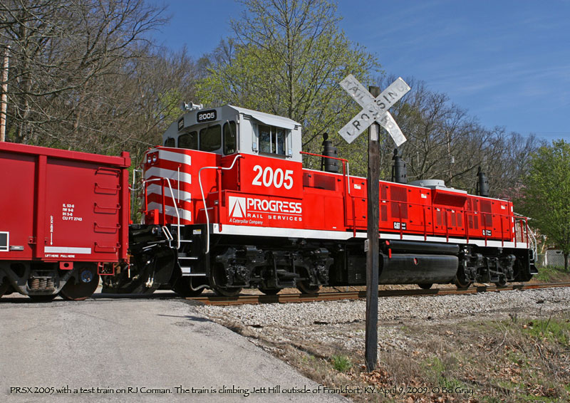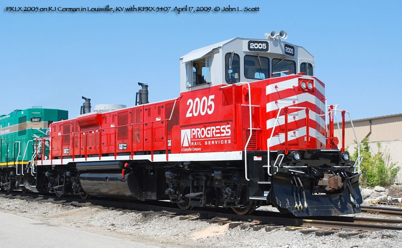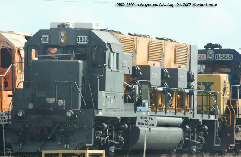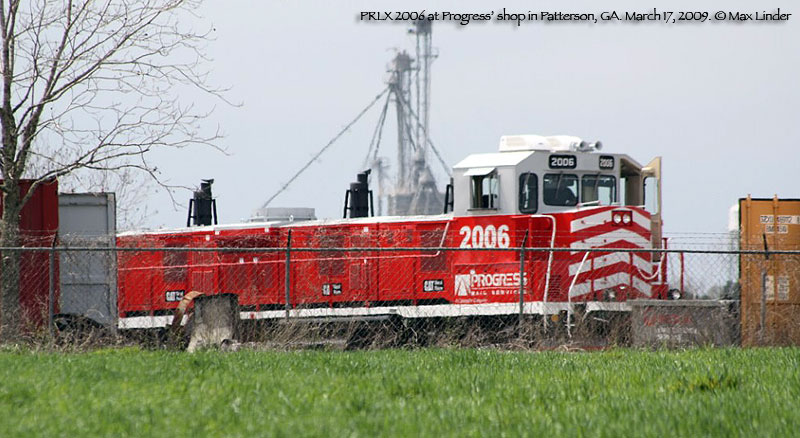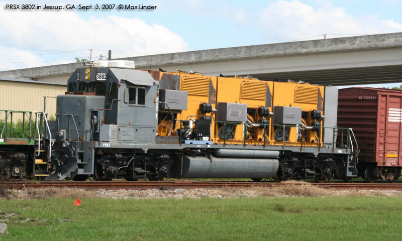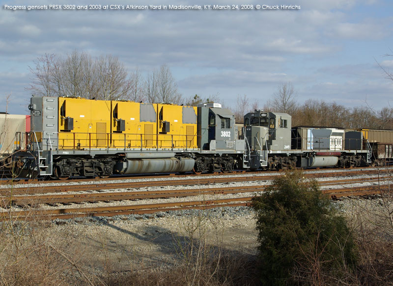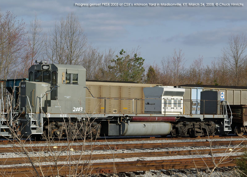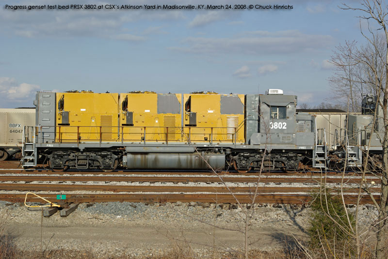 The first of Progress' gensets showed up briefly in Georgia in late August and early Sept. 2007. That unit, PRSX 3802, was apparently a test bed of some sort, as the gensets sat very high on the frame, and the unit had a conventional cab. Future arrivals were spotted in March and April 2008 with higher visibility cabs and much lower hoods. Production of the units has been split between Mayfield, KY and Patterson, GA. Progress documentation also mentions a twin engine model, but no units have been produced yet. In addition to the units listed below, a number of frames have been sighted at Mayfield, KY stripped and prepared for conversion.