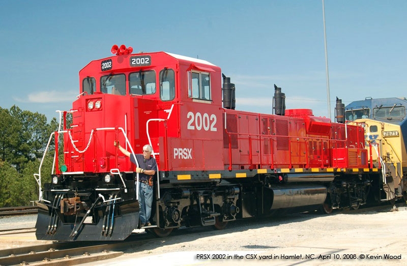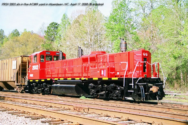 B. PRSX 2002 in NC in early May headed to the Aberdeen, Carolina & Western Railroad. From sightings and waybill info. Moved from the ACWR to CSX Intermodal (a Progress contract) in Fairfield, GA in Oct. 2008. Departed Fairfield in Jan. 2009 to NS. Tested at Inman Yard in Atlanta during January, then sent to Roanoke, VA for further testing by NS.