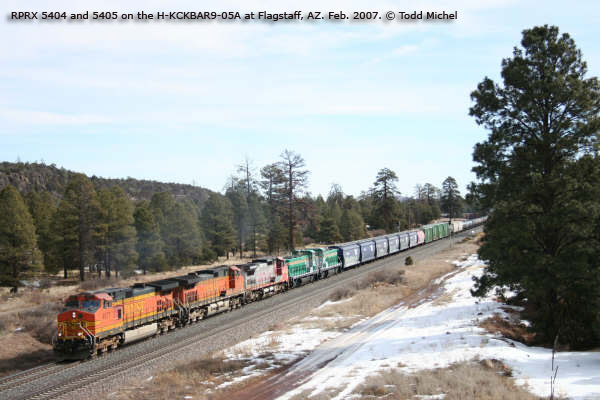 RPRX 5405 in transit at Flagstaff, AZ. Photo by Todd Michel. Feb. 2007. Click to enlarge. |