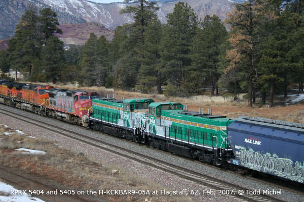 RPRX 5404 and 5405 in transit at Flagstaff, AZ. Photo by Todd Michel. Feb. 2007. Click to enlarge. |