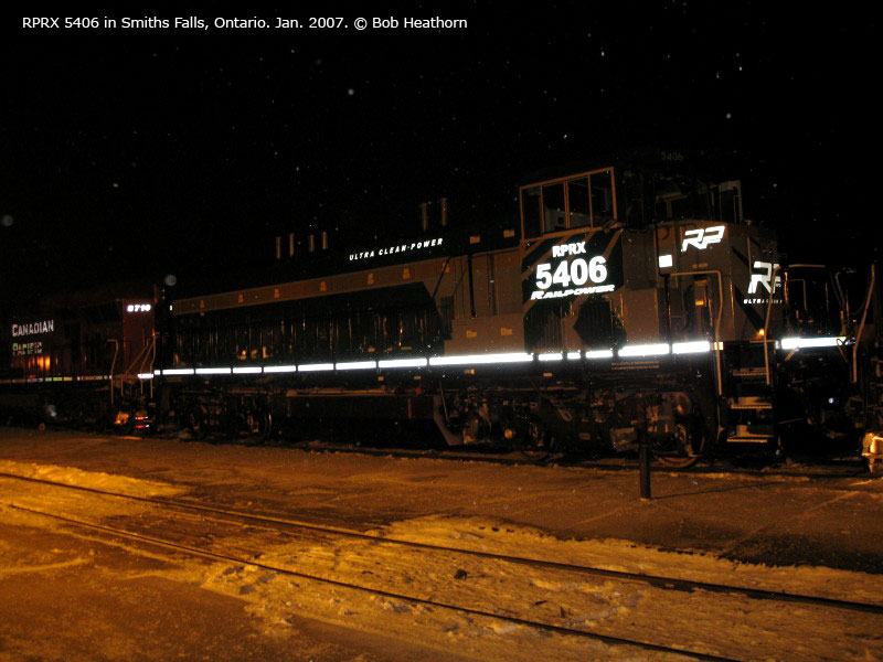 RPRX 5406 passing through Smiths Falls, Ontario on CP train 241-27 in the early hours of the morning. Jan. 27, 2007 photo by Bob Heathorn. Click to enlarge. |
