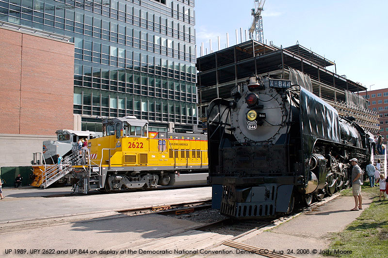 Rio Grande heritage unit UP 1989, UPY 2622, and steam engine UP 844 on display at the Democratic National Convention in Denver, CO. Aug. 24, 2008. Photo by Jody Moore. Click to enlarge. |