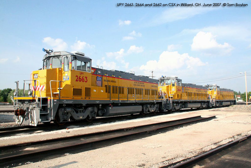 UPY 2663, 2664 and 2662 in Willard, OH on CSX on thier way UP in Texas. Photo by Tom Boylan. June 2007. Click to enlarge.
