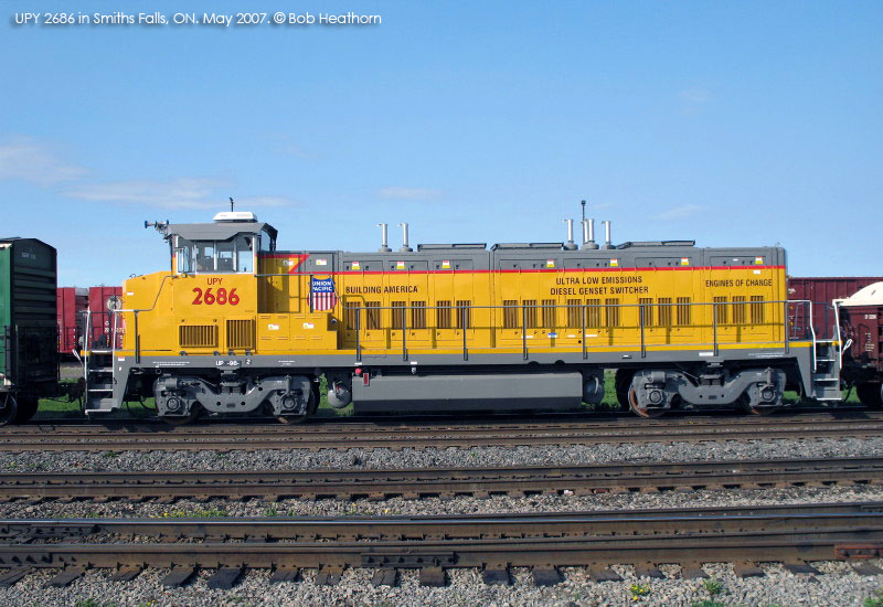 UPY 2685-2688 were spotted at CAD in early May 2007. From photo evidence from several sources. They are the first of 15 units to be built at CAD (presumed to be UPY 2685 to UPY 2699). From Railpower annual report 2006. |