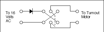 Depending on the size of a diode matrix, many turnouts may be thrown at once. This version throws as many as four. The rectifier diodes from the power pack are paralleled to increase their current handling capability although one diode will actually handle five motors. You can also use larger diodes. The power pack will also have to provide enough current to power several motors. I was able to run nine turnouts from an MRC 9300 power pack, but it didn't quite have enough output capability to handle ten. A 24 VAC 2 amp transformer (available at Radio Shack), and 2 or 3 paralleled 1 amp rectifier diodes should be sufficient to power a large matrix. Any power source should be properly fused for safety, preferably on both the primary and secondary sides. With 24 volts applied to one of my matrices, ten motors, six with LGB 1203 accessory contacts, operate very smartly.