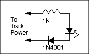 The circuit diagram for the LED installation is very simple. A series resistor limits the current to the LED to about 15 mA. The extra diode is not really necessary but I put it in anyway. The LED is a diode itself so that it automatically provides directional lighting. However, I found little data on how well these LED's put up with reverse bias so I added the diode to prevent the LED from avalanching. I did test it without the diode and it appeared to work ok, no detectable current was drawn. When the motor is off, the LED will be absolutely dark when the track polarity is reversed. With the motor on, it LED will light dimly anyway. I assume that is because there is commutator noise that spikes the track voltage just a little positive, even going in reverse. If your LED lights brightly in reverse instead of forward, reverse the power wiring to the whole circuit.