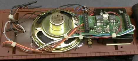 There is another sound feature of the Sierra that I didn't use. This is the coupler clank. If you mount your coupler so that it has a little forward and backward slop, and mount a microswitch behind it that will close when the coupler is tapped, the sound system can produce a "clank" sound that represents coupler knuckles banging together.