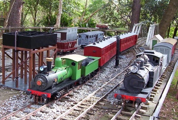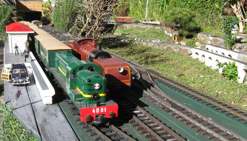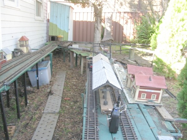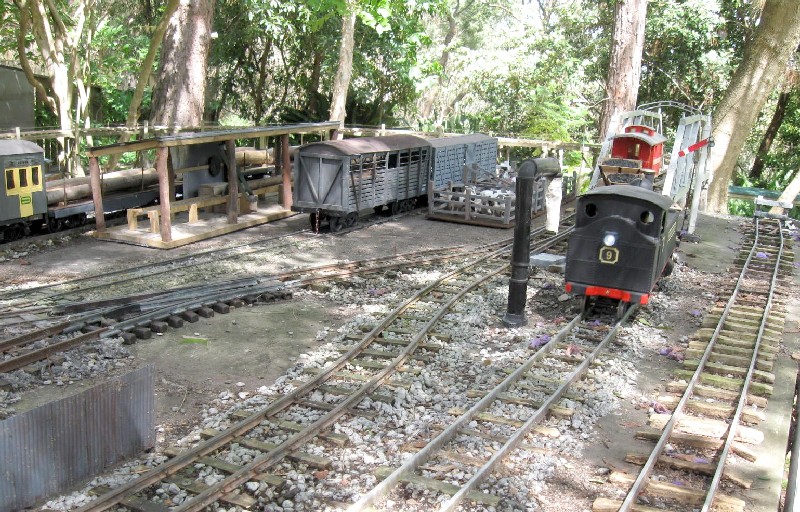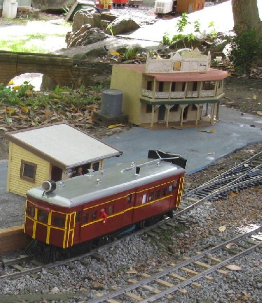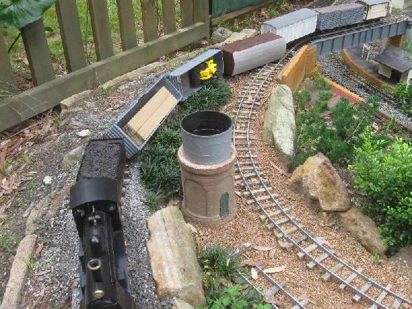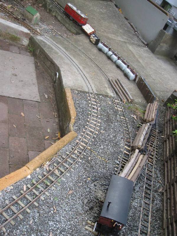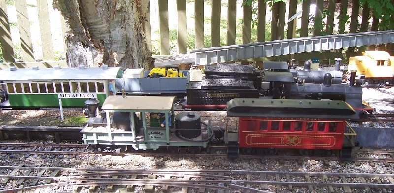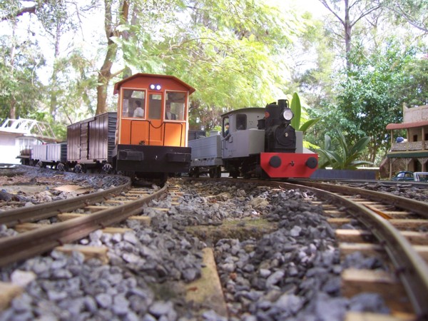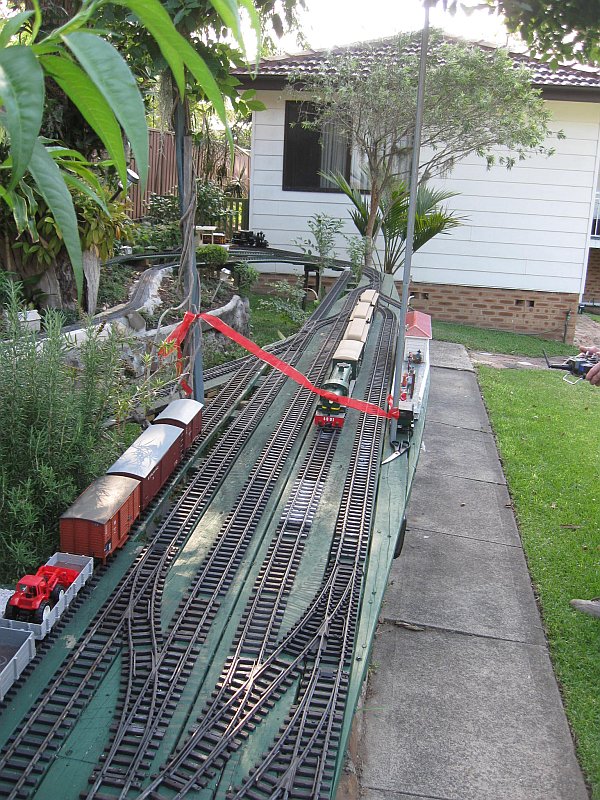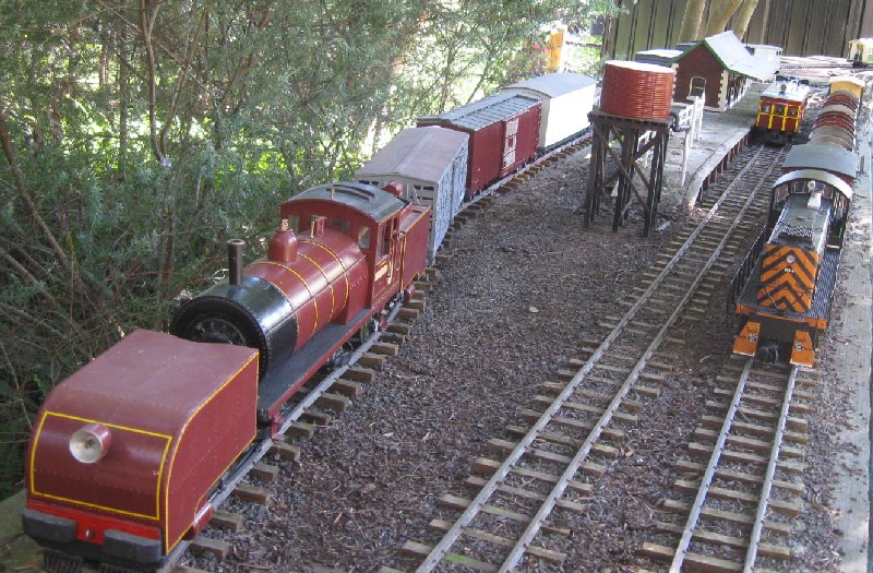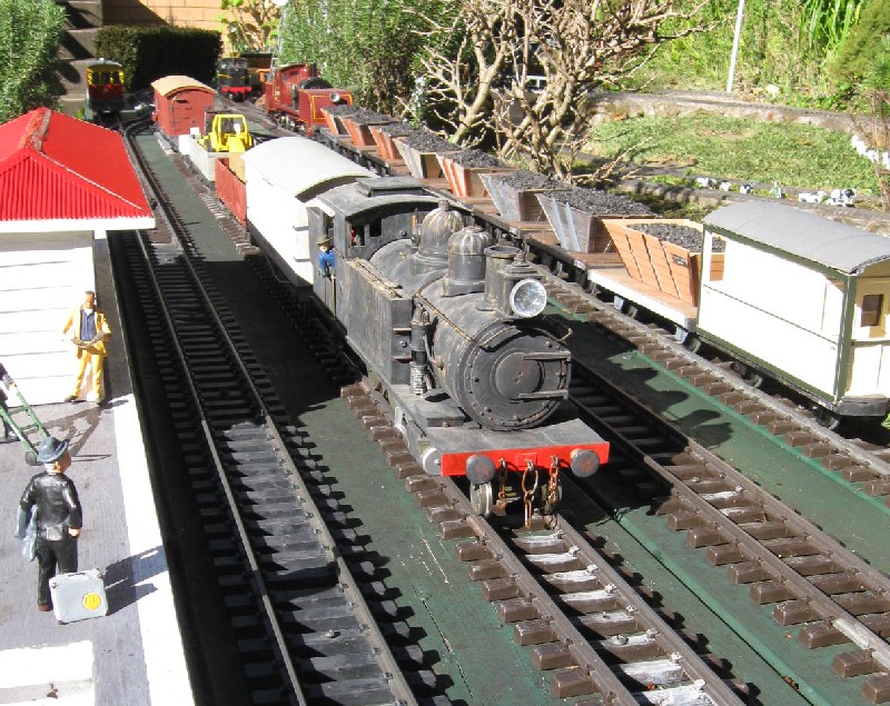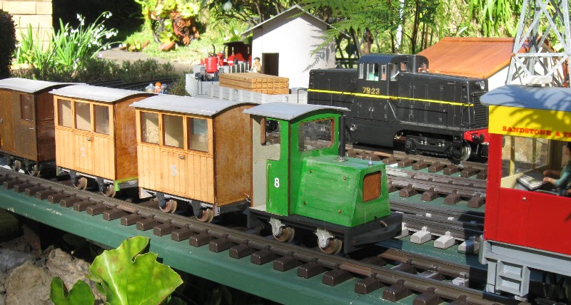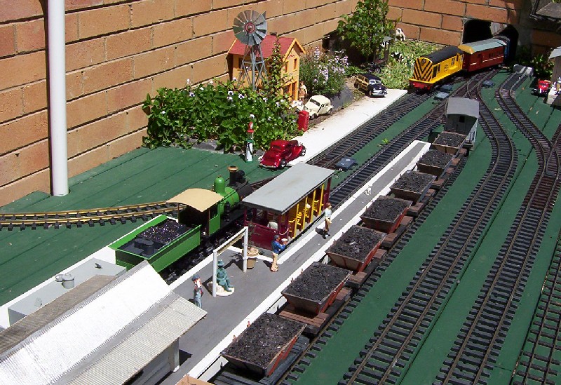 A busy day with 6 operators. Here at Bottle creek Geof's green Queensland 2-6-0 is in the back platform, Mark's Tasmanian X class approaches at top and a long line of Greg's old wooden coal hoppers trundles trough the front platform, while a tram waits in the dock.